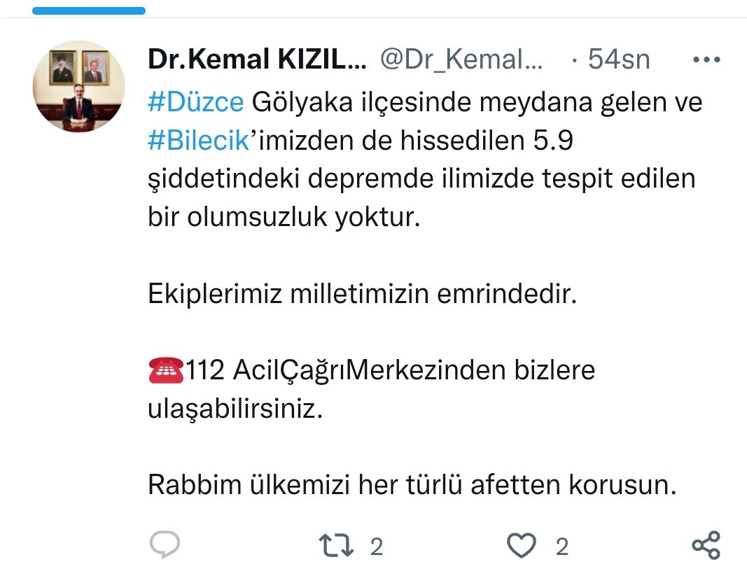 Bilecik Valisi Dr. Kemal Kızılkaya, Bilecik’te de hissedilen depremle ilgili yaptığı açıklamada şu ifadelere yer verdi: “Düzce Gölyaka ilçesinde meydana gelen ve Bilecik’imizden de hissedilen 5.9 şiddetindeki depremde ilimizde tespit edilen bir olumsuzluk yoktur. Ekiplerimiz milletimizin emrindedir.112 Acil Çağrı Merkezinden bizlere ulaşabilirsiniz. Rabbim ülkemizi her türlü afetten korusun.”