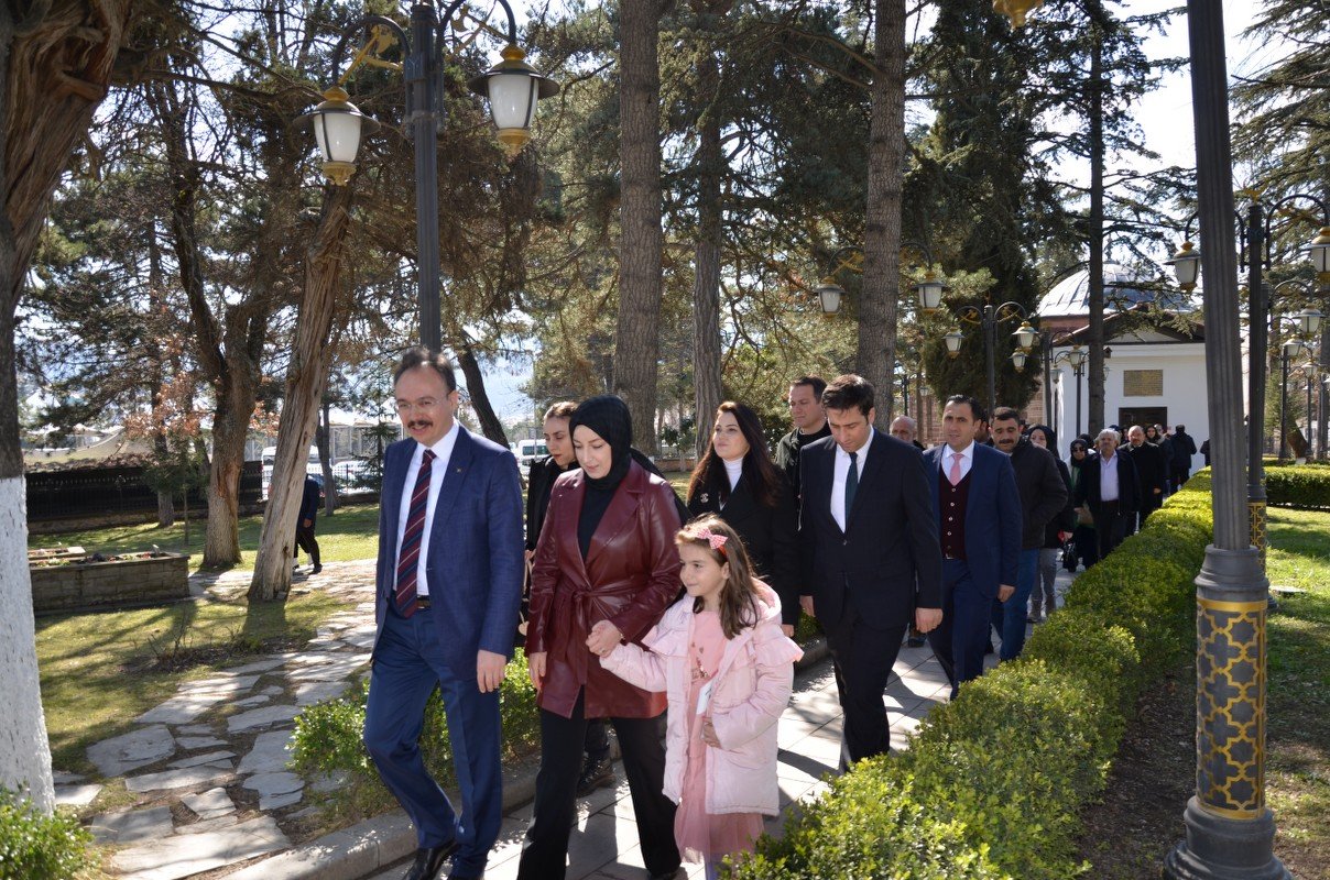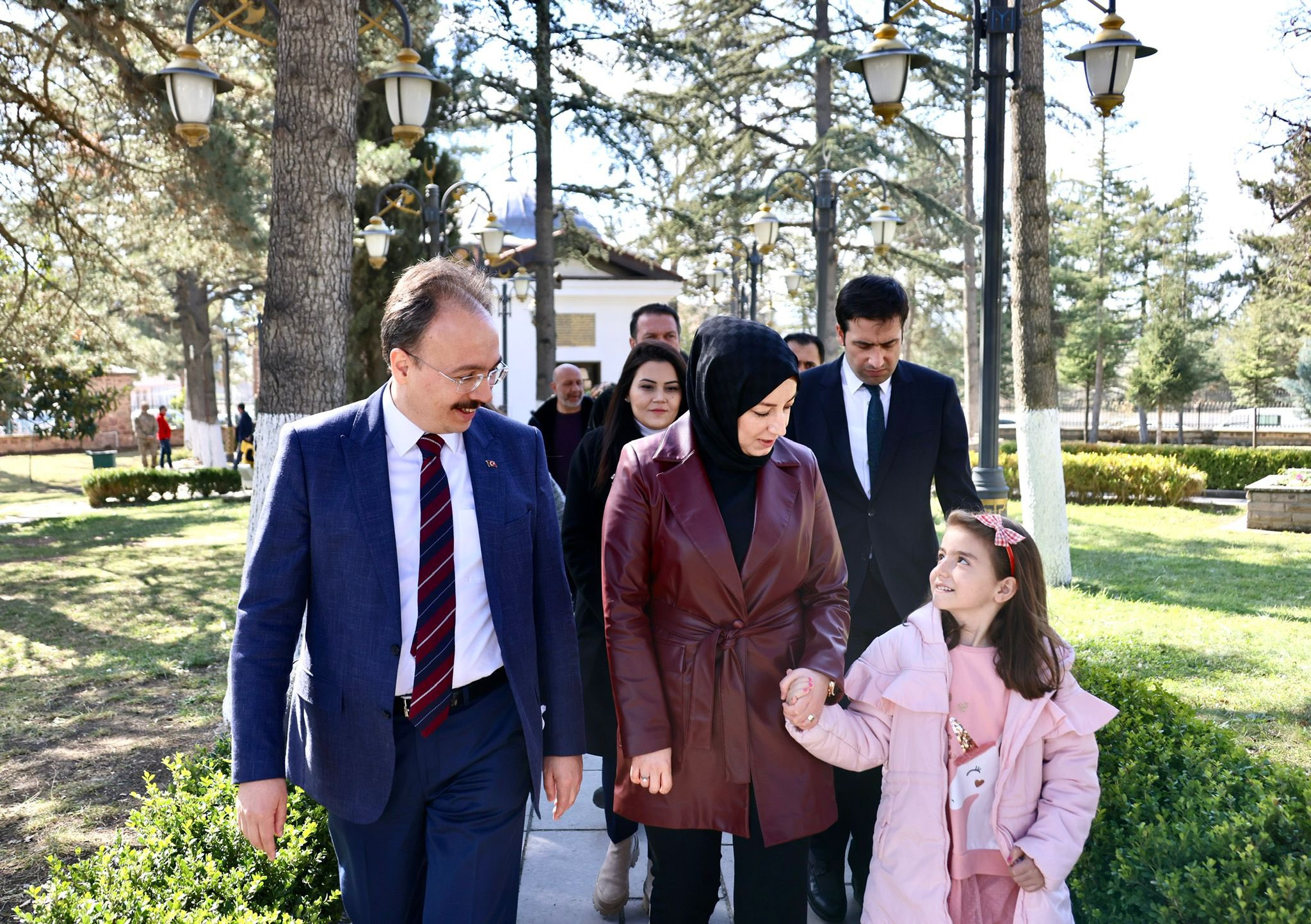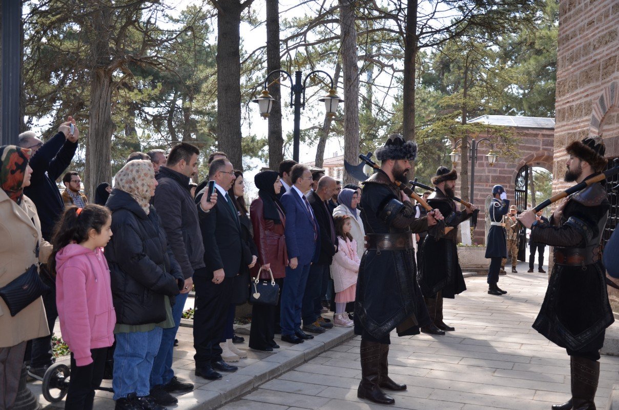 Vali Kızılkaya, eşi Nurten Kızılkaya, İlçe Kaymakamı Ömer Faruk Tuncer, eşi Çiğdem Tuncer, Belediye Başkanı İsmet Sever ile depremzede vatandaşlar, Ertuğrul Gazi Türbesi önünde Saygı Nöbeti değişimini izleyerek türbede dua ettiler.