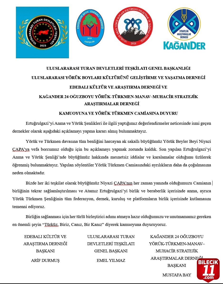 Uluslararası Turan Devletleri̇ Teşki̇latı Genel Başkanlığı, Uluslararası Yörük Boyları Kültürünü Geliştirme ve Yaşatma Derneği, Edebali Kültür Ve Araştırma Derneği̇ ve Kağander 24 Oğuzboyu Yörük-Türkmen-Manav-Muhaci̇r Strateji̇k Araştırmalar Derneği̇ Kamuoyuna ve Yörük Türkmen Camiasına bir duyuru yayımladı.