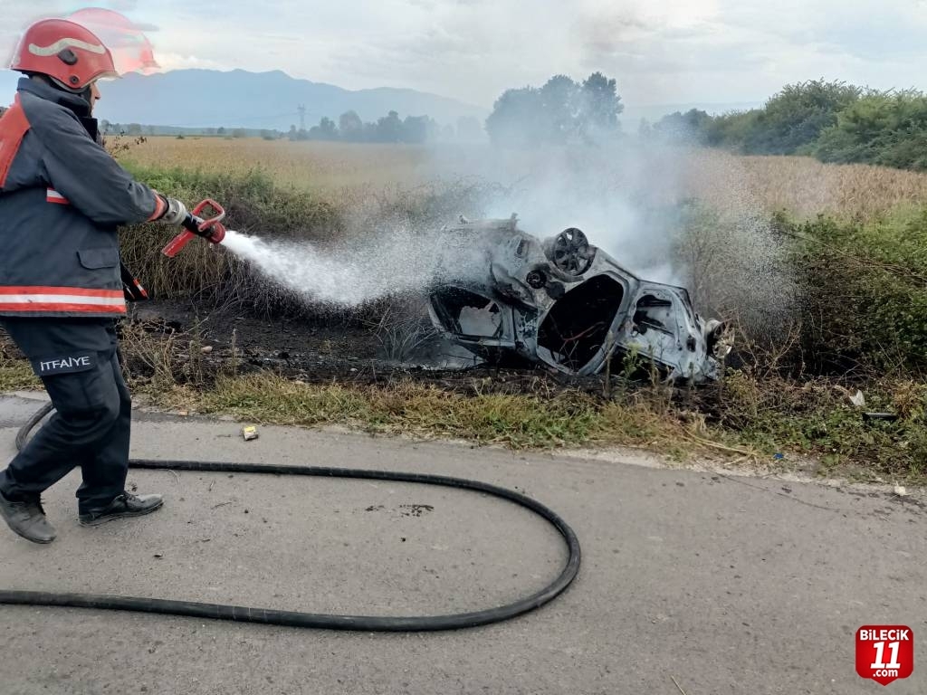 Sakarya’nın Akyazı ilçesinde yol kenarındaki otluk alana devrilen otomobil yanarak kullanılamaz hale geldi.