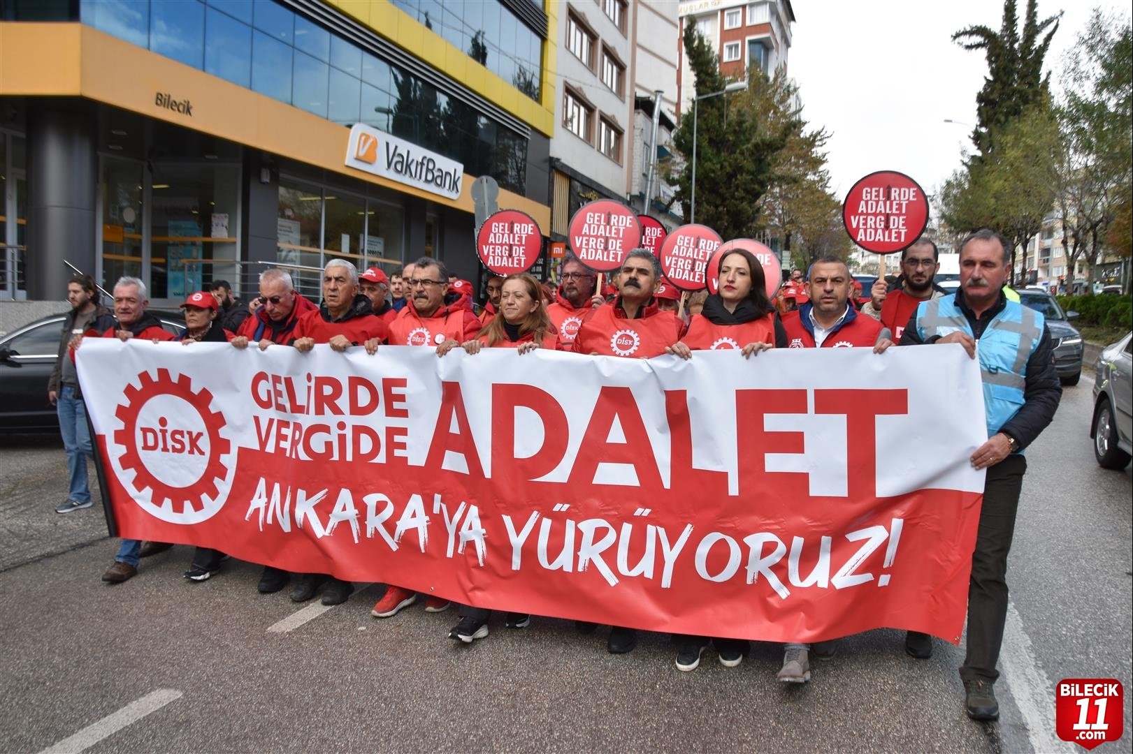 Devrimci İşçi Sendikaları Konfederasyonu’nun (DİSK) “Gelirde adalet vergide adalet” sloganıyla Kadıköy’den Ankara’ya başlattığı yürüyüş kapsamında sendikalılar Bursa’daki yürüyüşün ardından Bilecik’e ulaştı.
