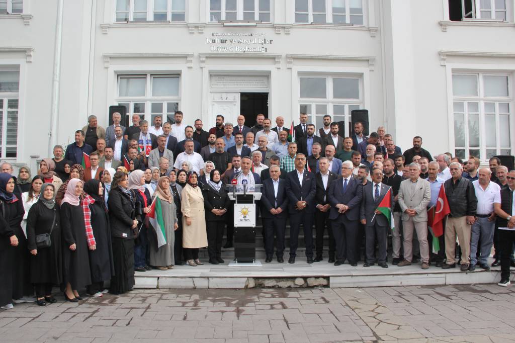 İl Başkanı Suat Güner, parti teşkilatı ve sivil toplum kuruluşları temsilcilerinin katıldığı protestoda, İsrail'in kurulduğu günden bu yana batının çifte standardı, iki yüzlülüğü ve ikircikli tavrını gösteren örnek olduğunu vurgulayarak, "7 Ekim'den bu yana acizlik, zayıflık ve sefaletini de göstermiş oldu. Bugün bu katliama ses çıkartmayan hiçbir devletin kendini ciddi devlet olarak görme hakkı yoktur." ifadesini kullandı.