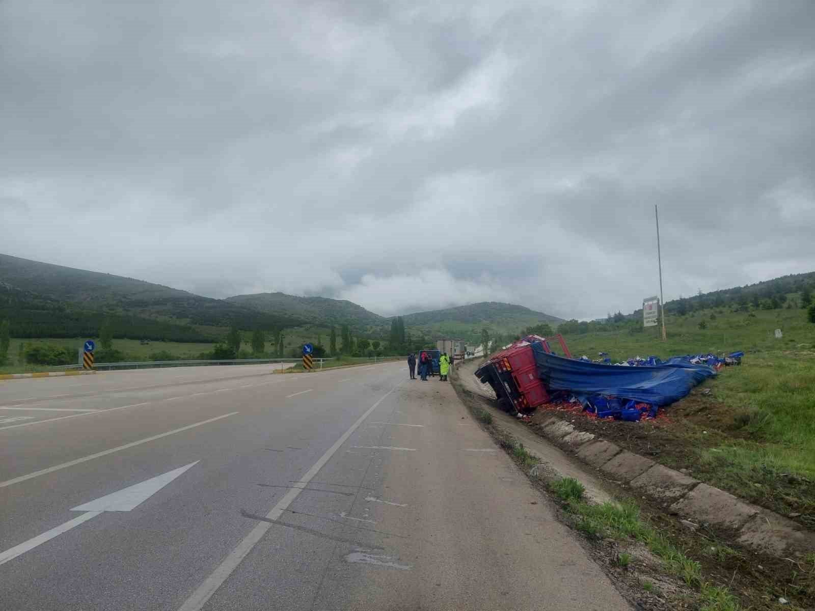 Afyonkarahisar’da kontrolden çıkarak şarampole devrilen domates yüklü tırda bir kişi yaralanırken, tırın dorsesinde bulunan tonlarca domates ise çevreye saçılarak ziyan oldu.
