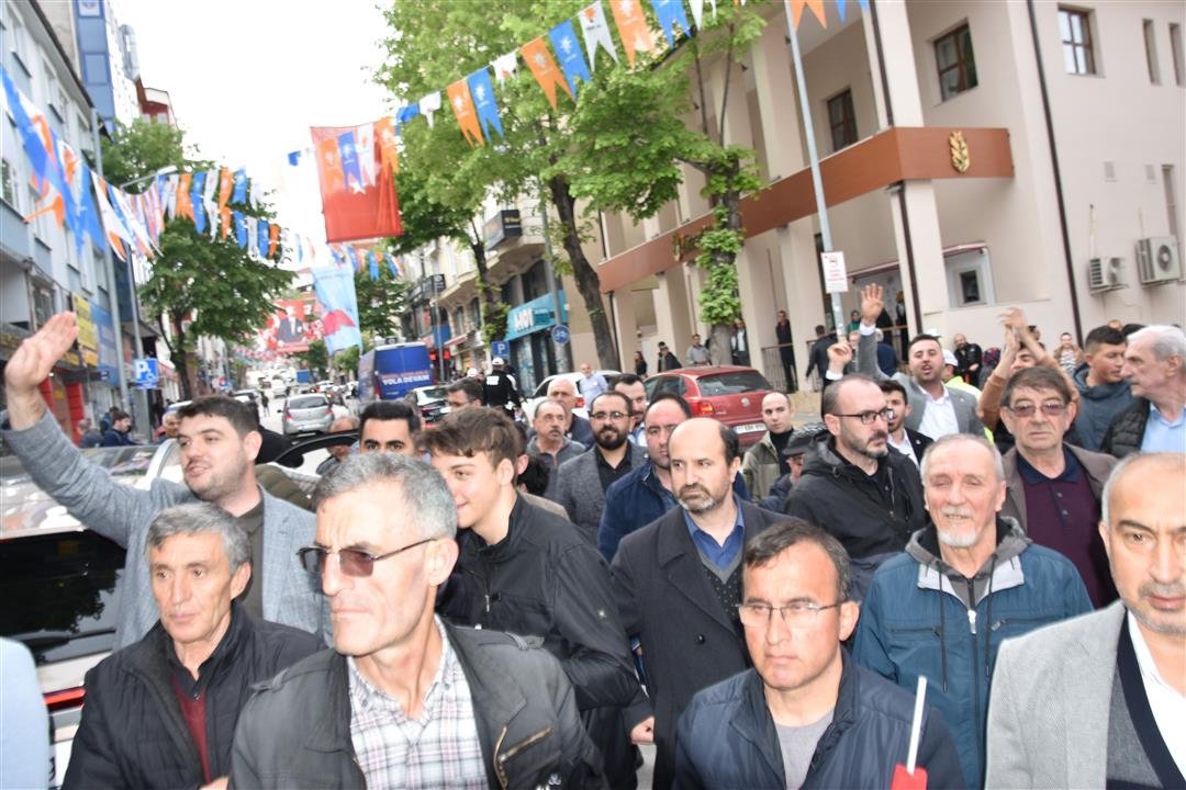 Yıllarca karayollarını kullandınız. Tek şeritli yollar vardı. Bir kamyonun arkasına düştüğünüz zaman saatlerce sollamaya çalışırdınız ve gidemezdiniz. Nitekim bir çok insanımızı bu yollarda kaybettim. Allah’a şükür şimdi bakın Mekece’den başlıyor Bozüyük’e kadar oto yol standardında son derece kaliteli yolu yaptık. Yetinmedik. Doğal gaz yoktu biz gelmeden önce burada. 2007’de Bilecik merkeze getirdik. Şimdi bakın sadece Bilecik merkezde değil, tüm ilçe ve beldelerimizde artık insanımız odun ve kömür yakmıyor. Çağdaş, konfor yakıt olan doğalgazı kullanıyor. Kim getirdi bu gazı, sormak gerekmez mi? Bizden önce bunların akılları neredeydi. Bu ülkeye doğalgaz 1986’da geldi, neden 20 yıl beklendi? Çünkü Recep Tayyip Erdoğan o zaman yoktu da o yüzden beklendi. İnşallah Pazar günü kritik bir gün, sandıklarımıza, oylarımıza sahip çıkacağız. Bilecik’imiz daha önce olduğu gibi başta adam gibi adam Recep Tayyip Erdoğan olmak üzere vekillerimiz Halil ve Hüsnü kardeşimize sahip çıkacak.”