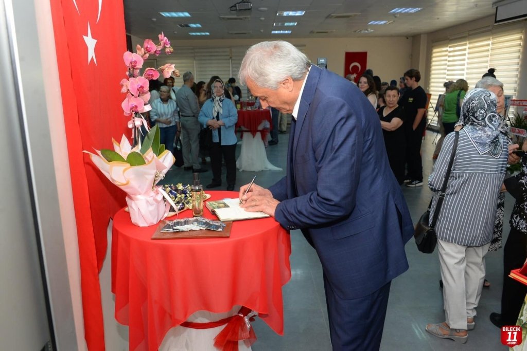 Serginin açılış kurdelesini Fehiman Gürcan, hocaları ve Halk Eğitim Merkezi Müdürü Levent Susam ile birlikte kesen Başkan Bakkalcıoğlu serginin hayırlı olması dileklerinde bulundu. Güzel çalışmaları için Gürcan’ı tebrik eden ve başarılarının devamını dileyen Başkan Bakkalcıoğlu sergi anı defterini imzaladı.