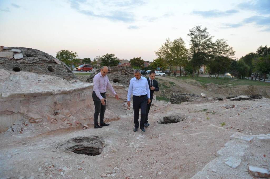 Edirne Valisi Yunus Sezer, ihya çalışmalarına devam edilen Gazi Mihal Bey Hamamı'nda incelemede bulundu.