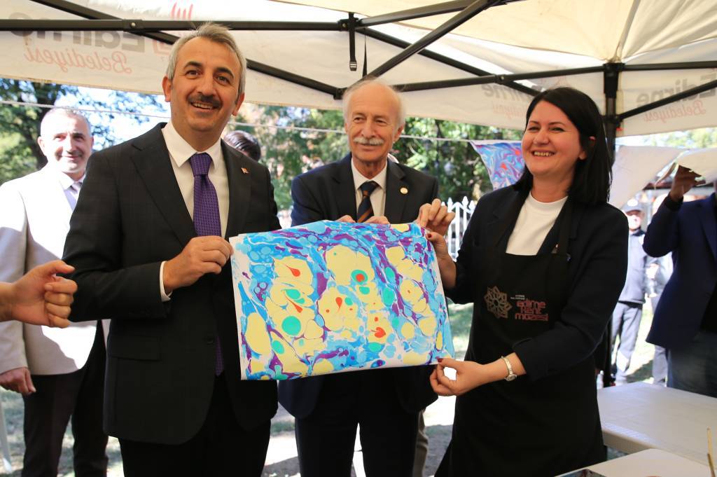 Konuşmaların ardından Sezer, Akın ve Hatipler stantları gezdi, sanatçılarla sohbet edip ve ebru sanatını icra etti.