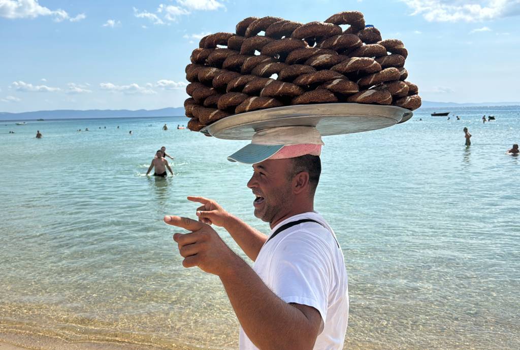 Başına koyduğu simit tepsisiyle sahilde yürüyerek simit satan Demirdöven, satış stiliyle de bölgeye gelen tatilcilerin dikkatini çekiyor.