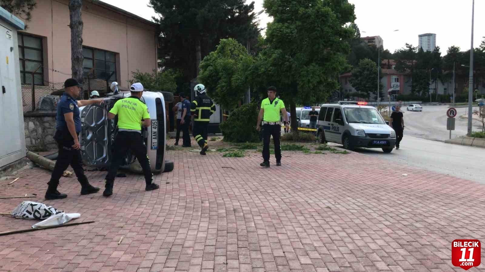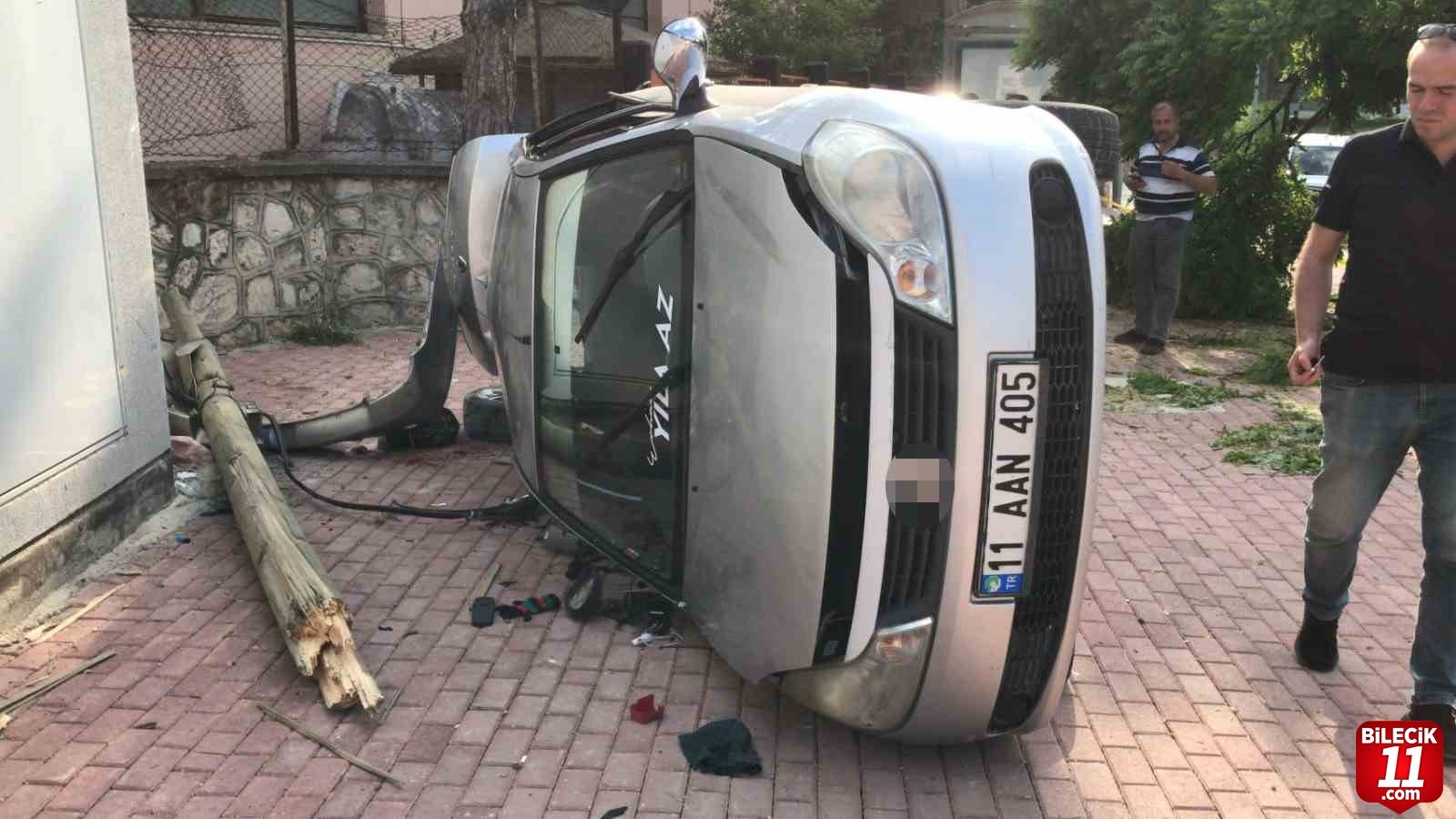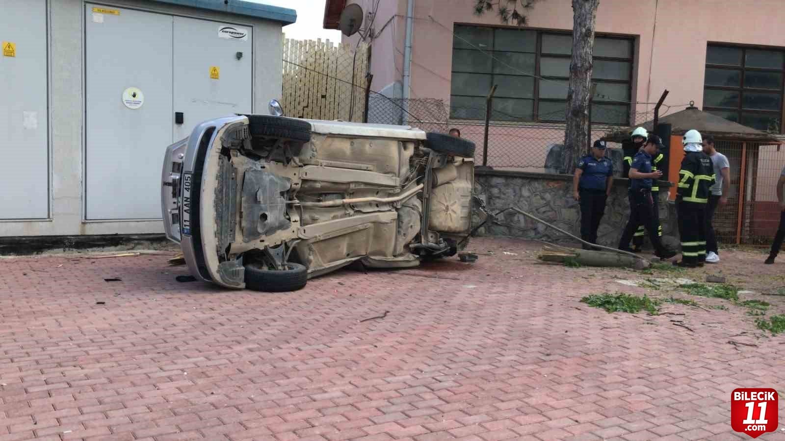Bilecik merkezden İstasyon Mahallesi istikametine seyir halindeki 11 AAN 405 plakalı otomobil sürücü M.Y. (15) Karayolları Kavşağı’nı geçtikten sonra direksiyon hakimiyeti kaybetti. Kontrolden çıkan araç önce yol kenarında bulunan kaldırıma çarpmasının ardından elektrik direğine çarparak takla attı. Meydana gelen kazada sürücü ile birlikte otomobilde yolcu olarak bulunan M.C. (15), B.G. (15) ile E.Y. (15) yaralandı. Yaralılar olay yerinde yapılan ilk müdahalesin ardından Bilecik Eğitim ve Araştırma Hastanesine kaldırıldı.