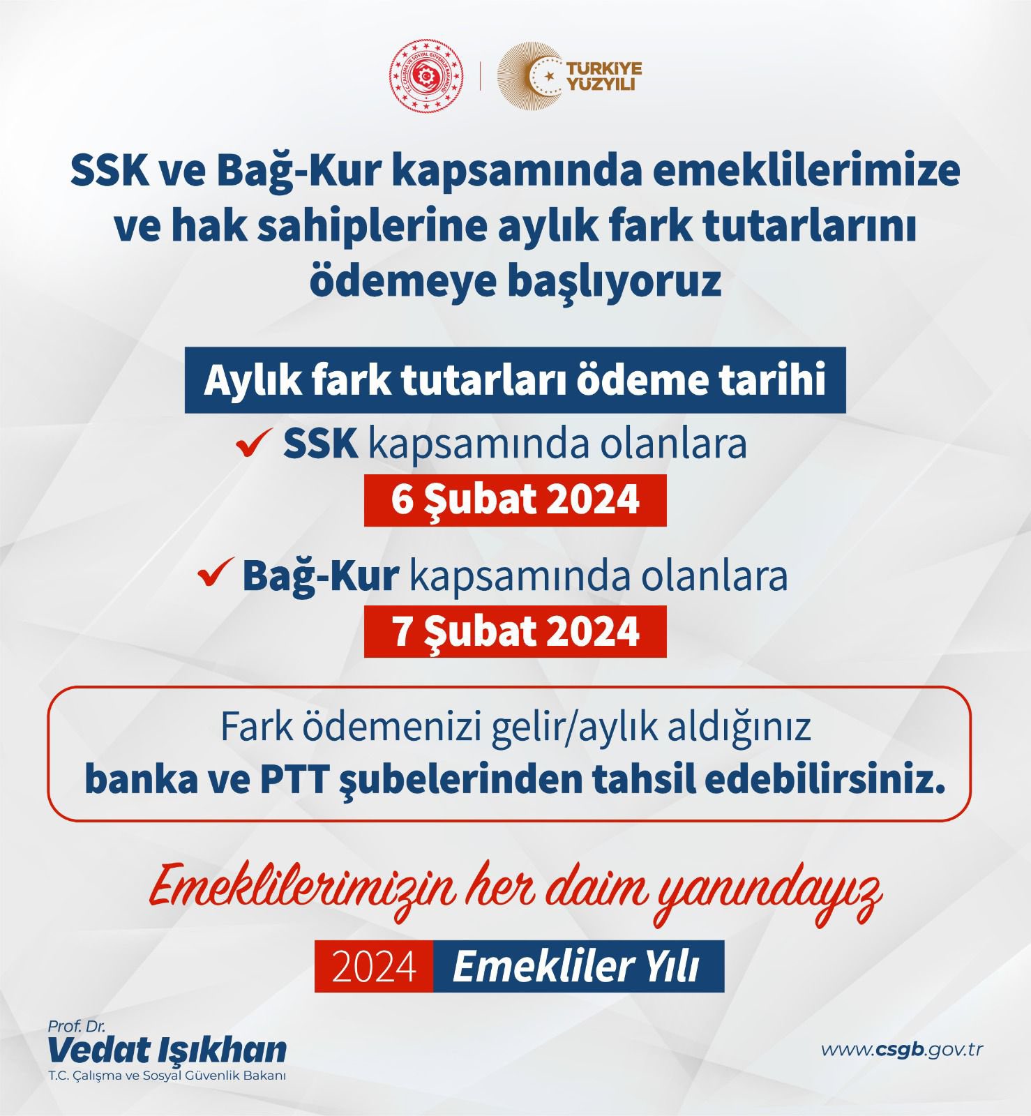 “Ocak 2024 itibarıyla %49,25 oranında yükseltme yaptığımız SSK ve Bağ-Kur emeklilerimiz ile hak sahiplerinin aylık fark tutarlarını ödemeye başlayacağız. Ödemeler; SSK kapsamında emekli olan vatandaşlarımız için 6 Şubat’ta gerçekleştirilecek. Bağ-Kur kapsamında emekli olan vatandaşlarımız için 7 Şubat’ta gerçekleştirilecek.”