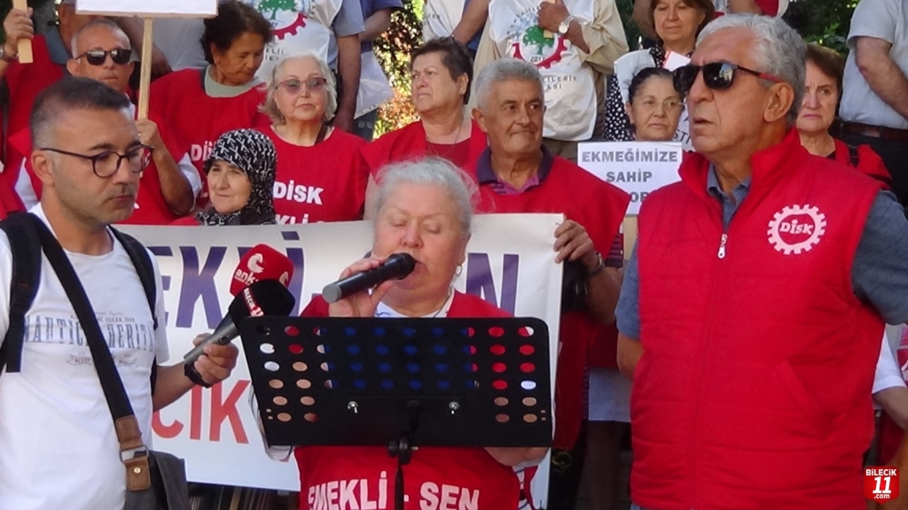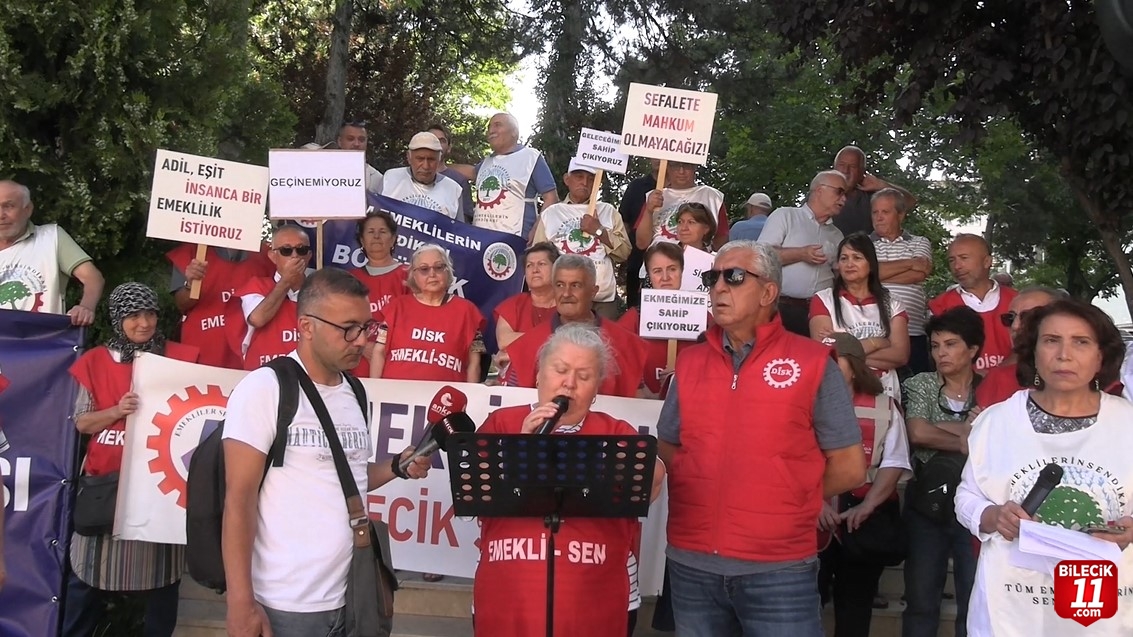Bilecik’te emekliler belirlenen aylıklara tepki gösterdi. Atatürk Parkı’nda bir araya gelen sendika üyeleri adına yapılan açıklamada, “Bugün en düşük emekli aylığı, Hazine desteğiyle birlikte 14.469 TL iken, açlık ve yoksulluk sınırı hızla tırmanmaktadır. Yapılacak zamlardan sonra bile emekli aylıkları, açlık sınırının binlerce lira altında kalacaktır. On altı milyonu aşkın emekli ve hak sahibini açlığa mahkûm edenler, utanmadan, sıkılmadan yine aynı açıklamaları yapacaktır. Biz emekliler geçinemiyoruz, barınamıyoruz, beslenemiyoruz. İnsanca bir yaşam için seyyanen zam istiyoruz. Bu ülkede emekliler enflasyon karşısında ezilmektedir. Mevcut kaynaklar emekliler için kullanılmamaktadır.” denildi.