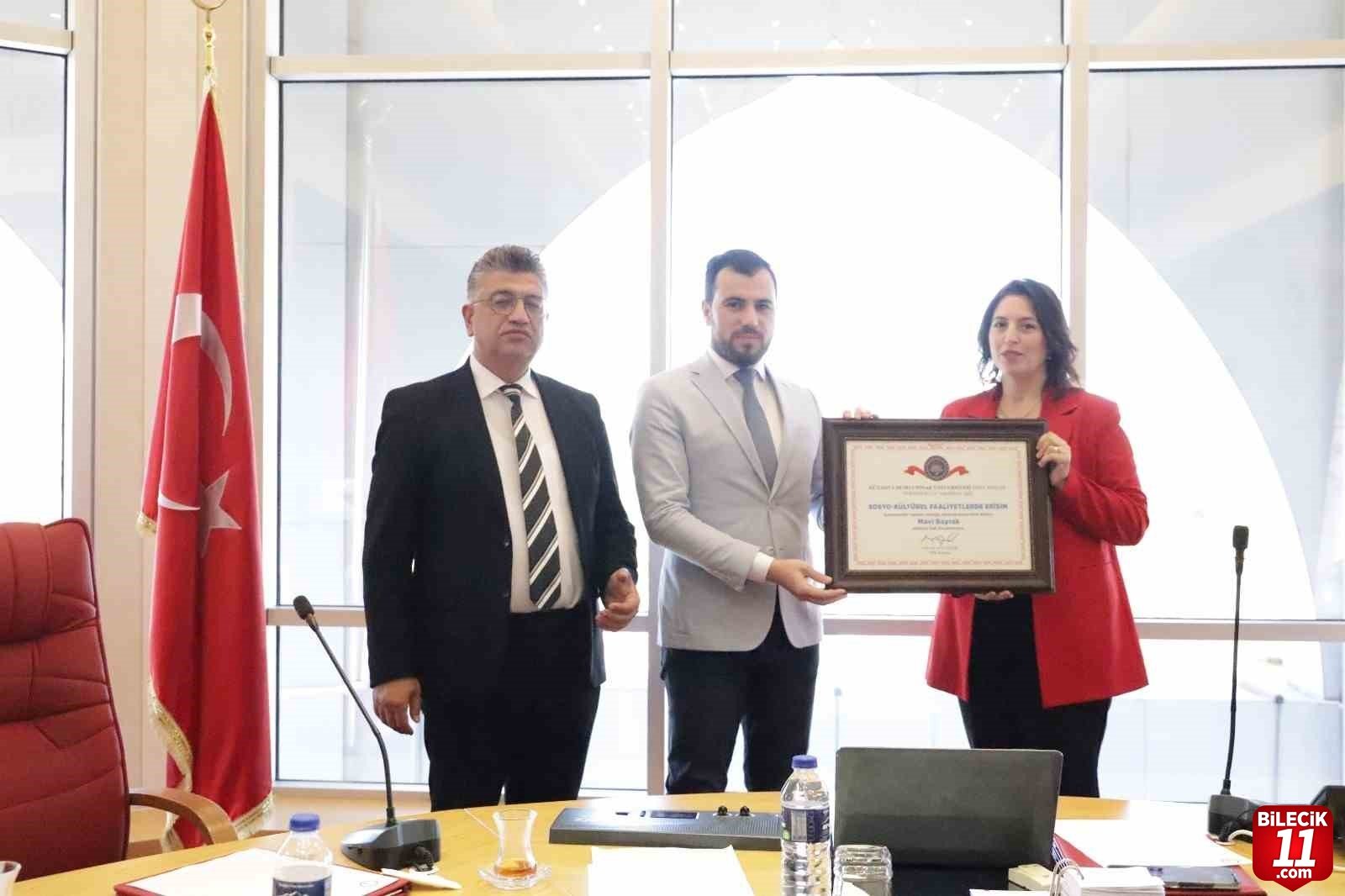 YÖK Başkanı Prof. Dr. Erol Özvar imzalı ödül belgesi ve Mavi Flama Rektör Prof. Dr. Süleyman Kızıltoprak tarafından Emet Meslek Yüksekokulu Müdürü Öğr. Gör. Vedat Bakır’ a takdim edildi. – İHA