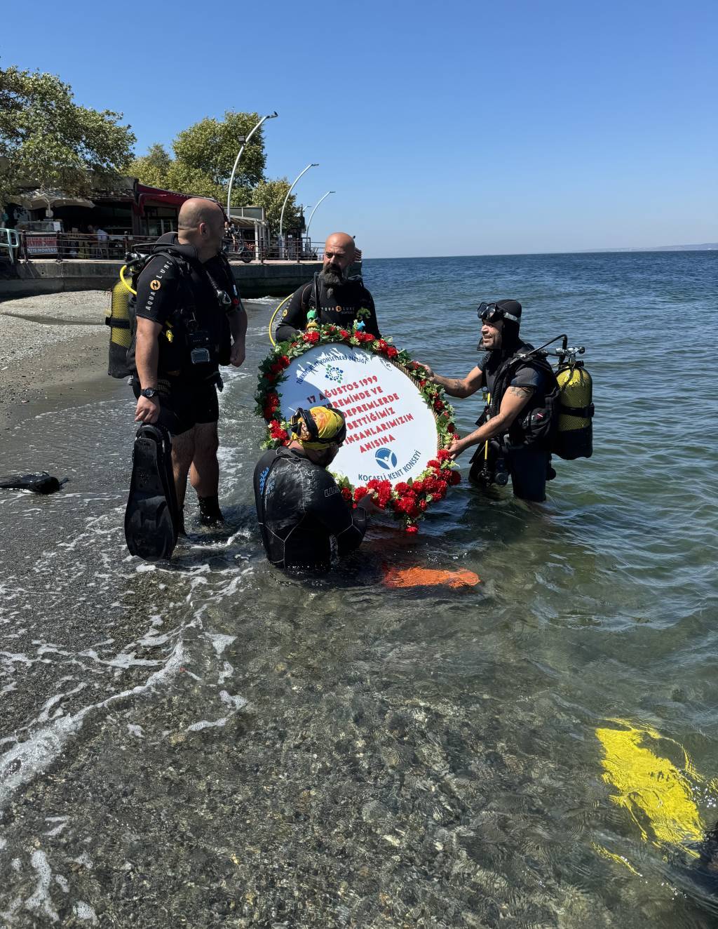 Türkiye Kent Konseyleri Birliği ve Kocaeli Kent Konseyinin "17 Ağustos 1999 Depreminde ve diğer depremlerde kaybettiğimiz tüm insanlarımız anısına" yazılı çelengini su altına bırakan Koçak, dalışı, kurtarma ekiplerinin enkaz altında kalanlara ulaşmak için sıklıkla kullandığı "Sesimi duyan var mı?" seslenişiyle tamamladı.