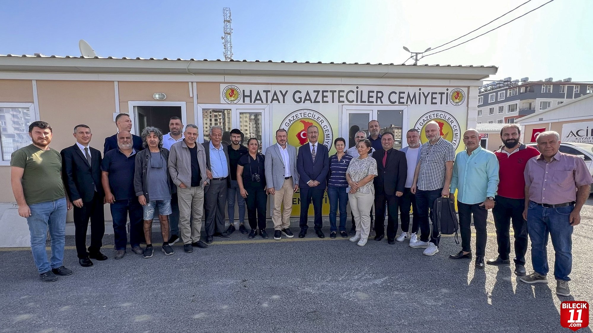 Hatay Valisi Mustafa Masatlı’yı ziyaret eden Erkılınç, Hatay Gazeteciler Cemiyeti’nin geçici olarak faaliyet gösterdiği prefabrik işyerinde süreli yayınların temsilcileriyle buluştu.