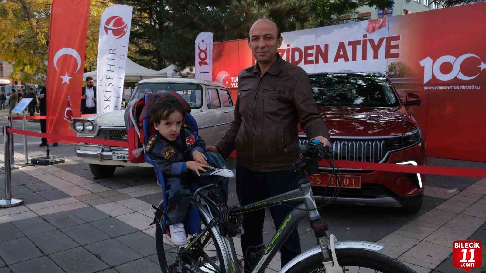 Eskişehir’de vatandaşlar, 29 Ekim Cumhuriyet Bayramı’nın 100. yılını yerli otomobiller Devrim ve Togg’un önünde fotoğraf çektirerek kutladı.