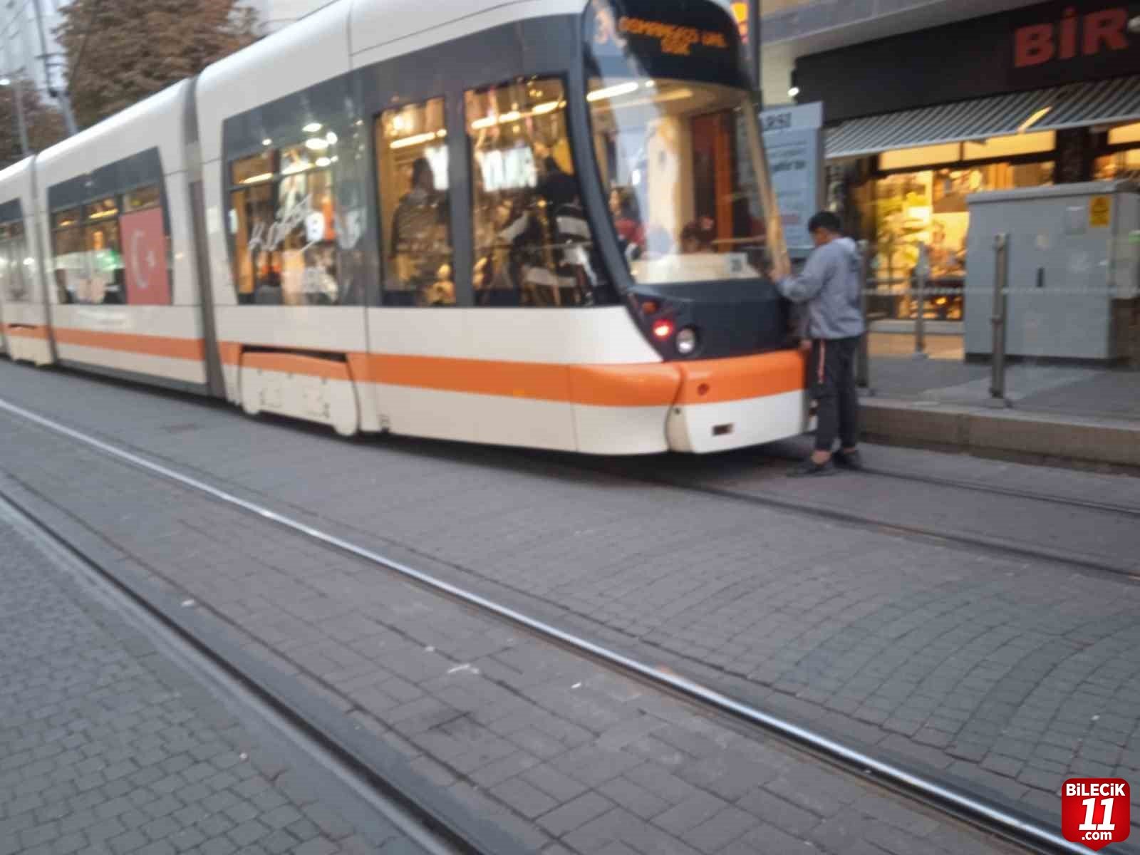 Eskişehir’de bir çocuğun, duraktan hareket etmeye hazırlanan tramvayın arka kısmına tutunma görüntüsü tepki çekti.