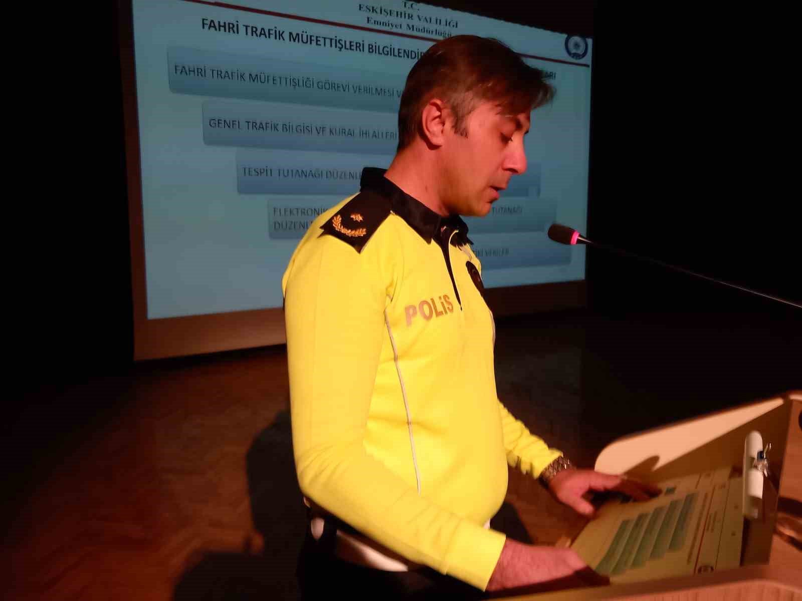 Fahri trafik müfettişlerinin katılımıyla gerçekleştirilen toplantıda Eskişehir’de yaşanan trafik sorunları konuşuldu. Bilgilendirme için konuşan 4. Sınıf Emniyet Müdürü Trafik denetleme Şube Müdürü Hakan Solak, “Fahri trafik müfettişlerine; kural ihlali gerçekleştiren sürücülere trafik kural ihlali tespit tutanağı düzenlenirken dikkat edilecek hususlar anlatıldı. İhlal tespit tutanakları ve bu tutanakların dönüştürülmesi sonucu oluşan idari para cezası, karar tutanaklarına ilişkin veriler ile mevzuat değişiklikleri hakkında gerekli bilgilendirmeler yapıldı. Fahri trafik müfettişleri, trafik ceza tutanaklarını 7 gün içinde göndermesi gerekir. Trafik ceza maddeleri hakkında bilgiler’’ dedi.