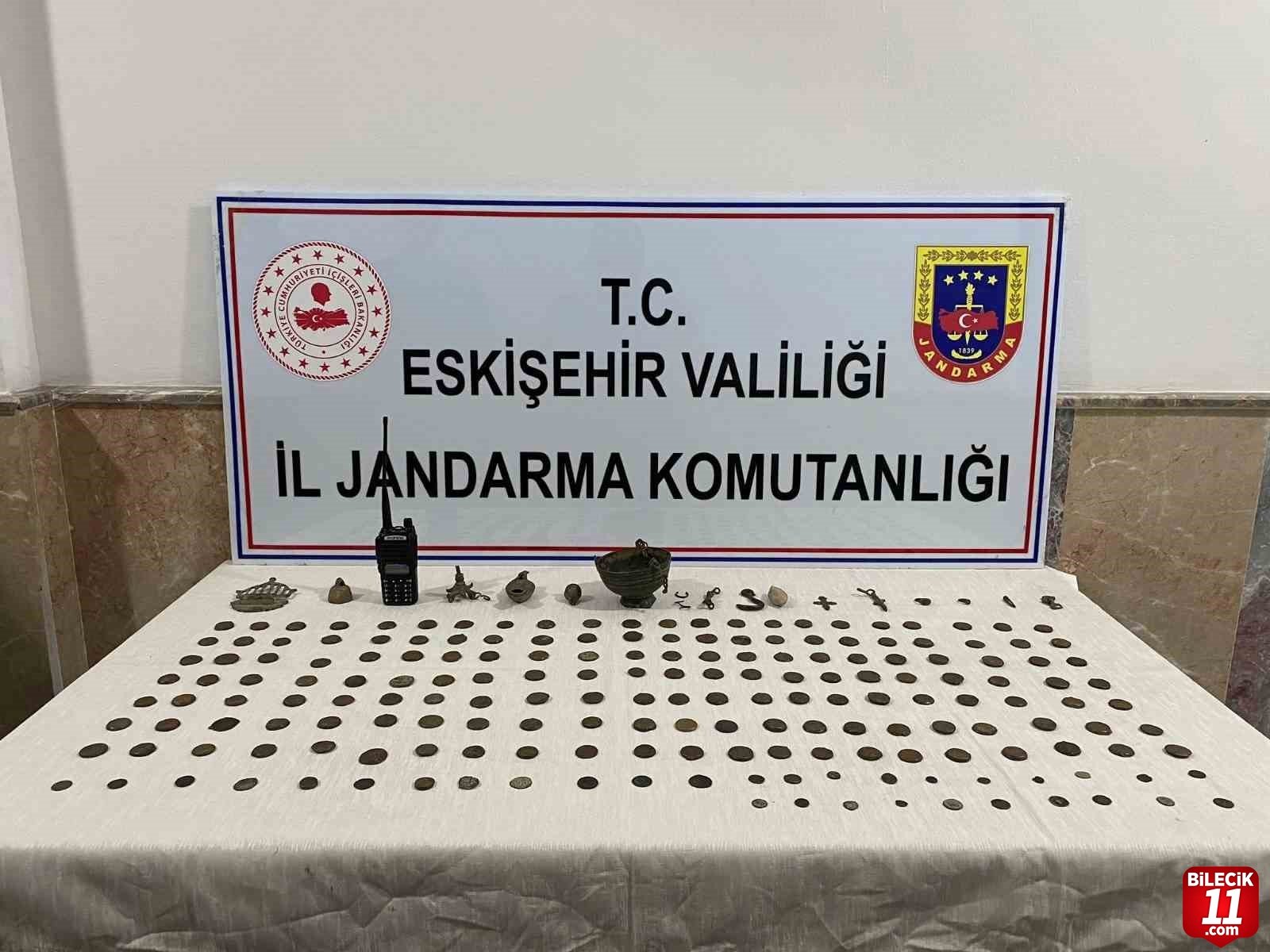 Eskişehir İl Jandarma Komutanlığı Kaçakçılık ve Organize Suçlarla Mücadele (KOM) Şube Müdürlüğü ekiplerince bir şahsın elinde bulundurduğu tarihi eser olduğu değerlendirilen Roma dönemine ait sikkeleri satmak için müşteri aradığı tespit edildi. Cumhuriyet Başsavcılığı ile koordineli olarak yapılan operasyon sonucunda yakalanan şahsın aracında yapılan aramada Roma dönemine ait olduğu değerlendirilen 186 adet bronz sikke, 15 adet obje, 2 adet yüzük ve 1 adet el telsizi ele geçirildi.