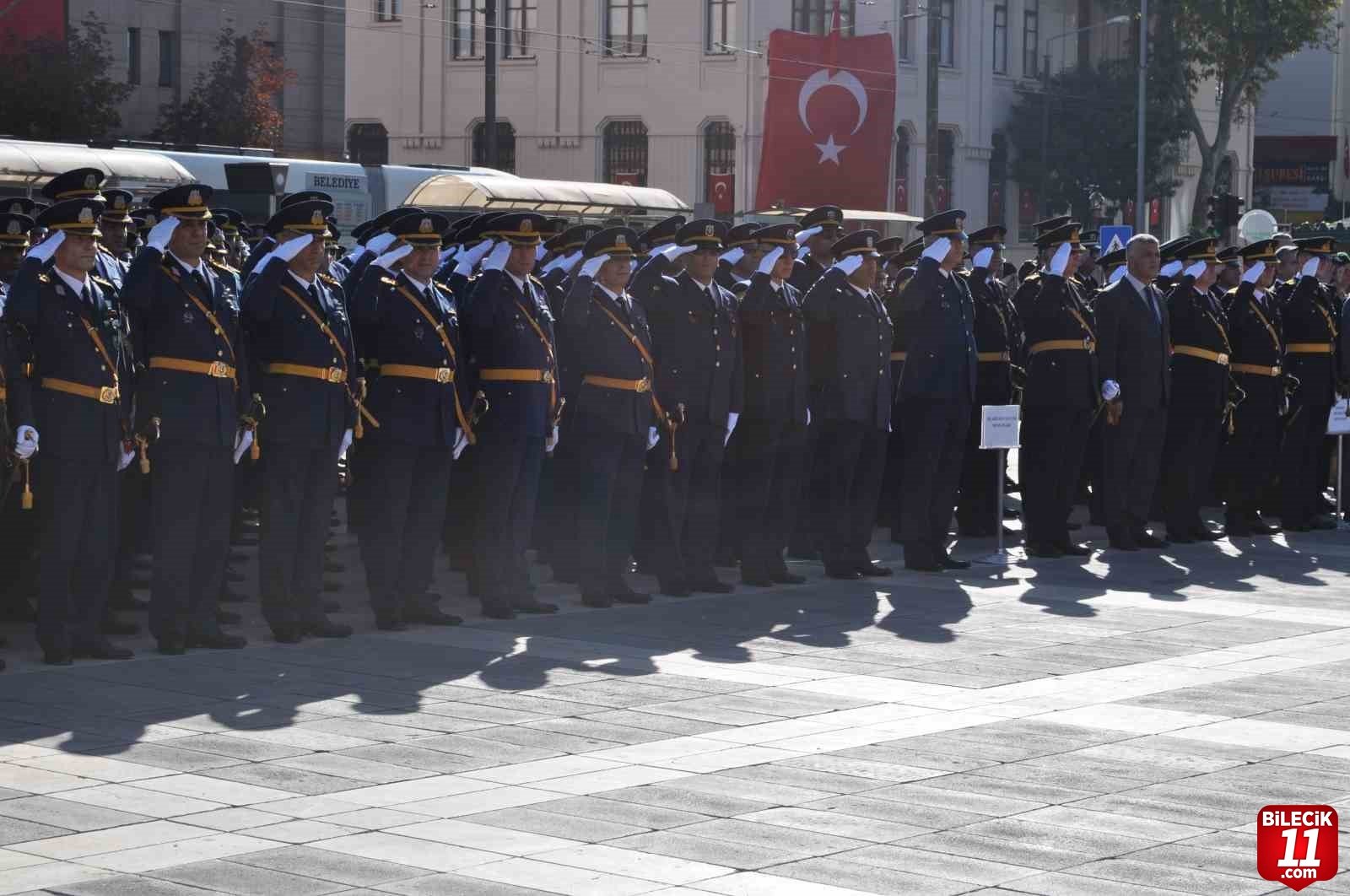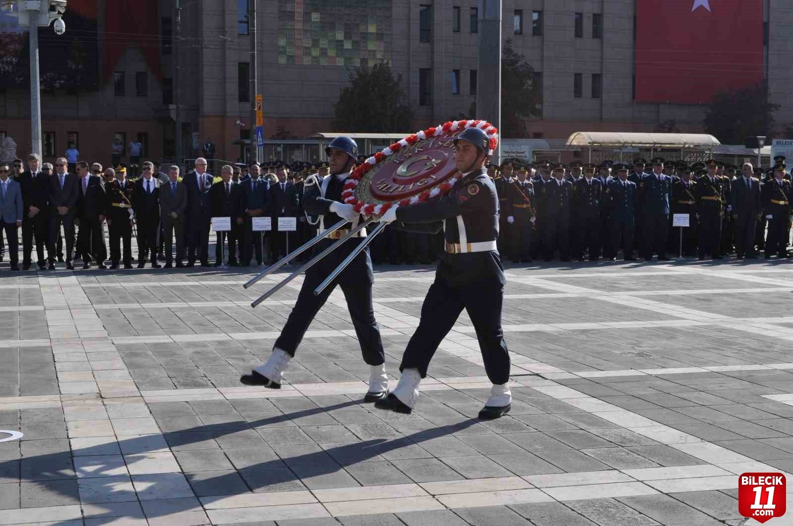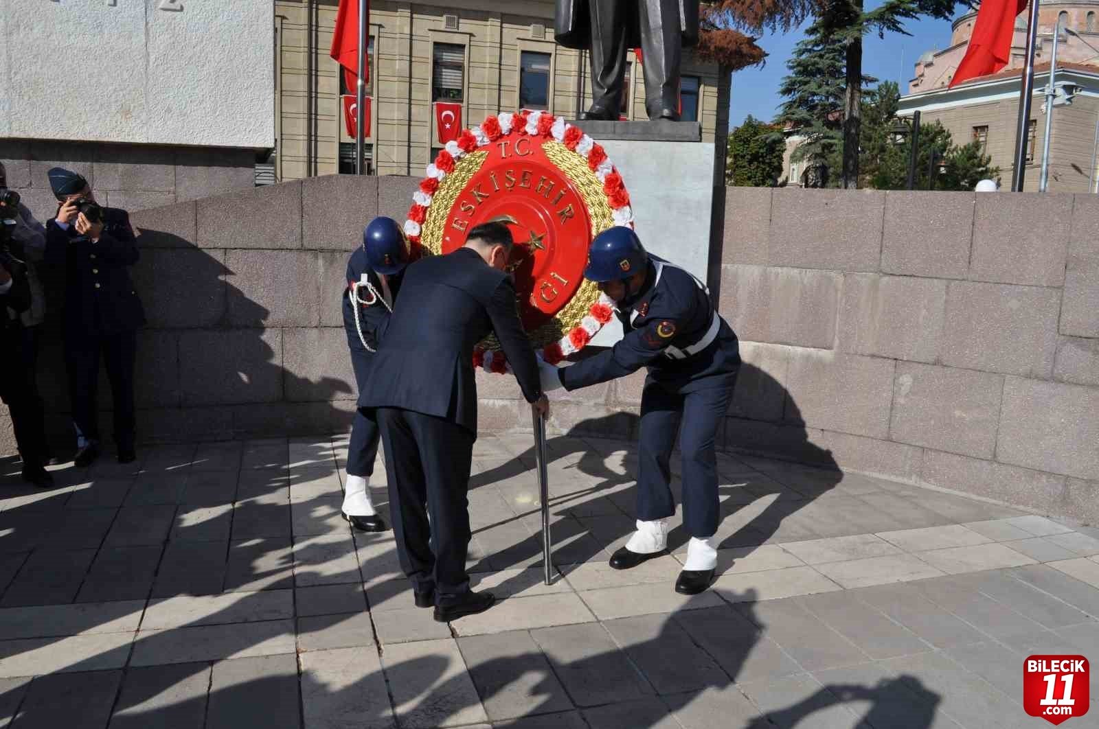 Valilik Meydanı’nda gerçekleştirilen törende ilk olarak günün anlam ve önemini belirten bir konuşma yapıldı. Ardından Eskişehir Valisi Hüseyin Aksoy ve Muharip Hava Kuvvetleri Komutanı İsmail Güneykaya, Atatürk heykeline çelenk sundu. Tören, saygı duruşunda bulunulduktan sonra askeri bando eşliğinde İstiklal Marşı’nın okunmasıyla sona erdi.