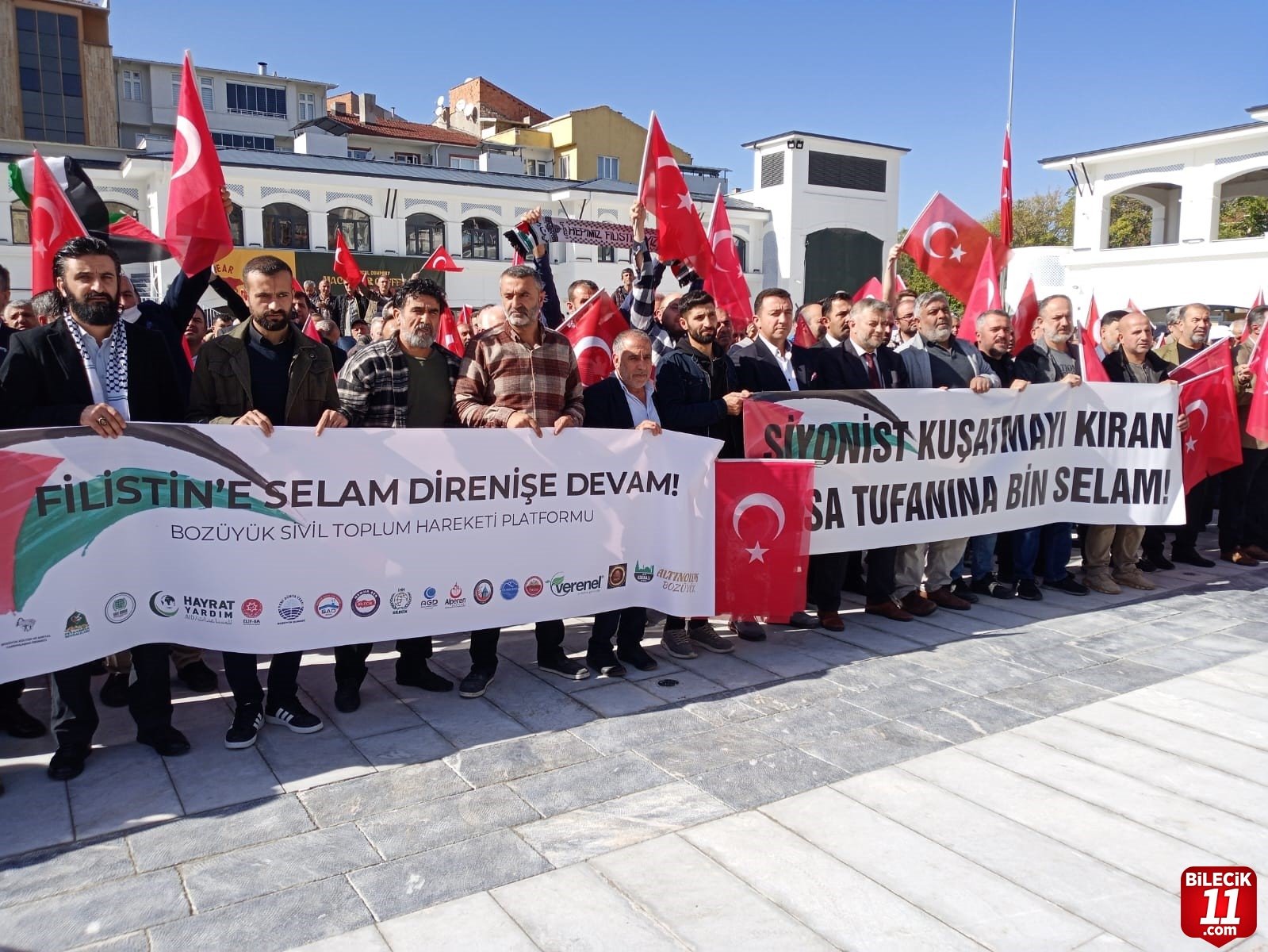 Bozüyük Sivil Toplum Harekatı Platform üyeleri, İsrail’in Filistin’e yönelik saldırılarını protesto etmek için bir araya gelerek basın açıklamasında bulundu.