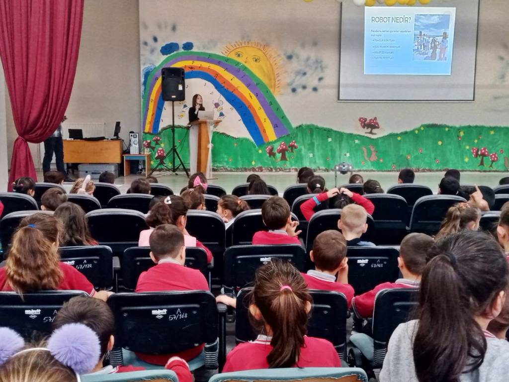 Okulun Çok Amaçlı Konferans Salonu'ndaki seminerde robotik kodlama eğitmeni Fatmanur Çakal, çağın bilgi ve teknoloji çağı olduğuna dikkati çekti.