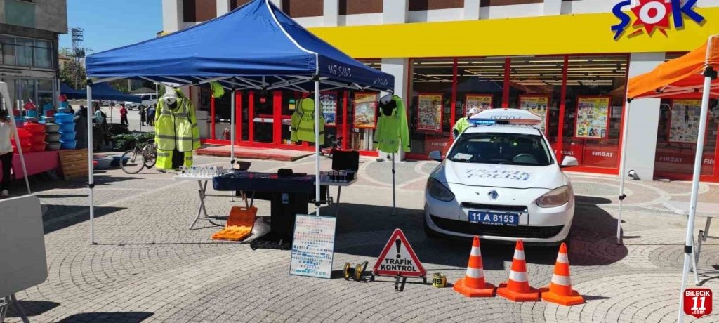 Bilecik’in Gölpazarı ilçesinde kurulan trafik stantlarında trafik haftası etkinliği yapılırken, çocukları bilgilendirildi.