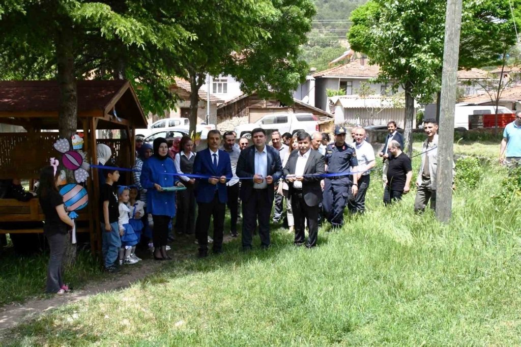 Kütahya’nın Emet ilçesi Göncek köyünde anasınıfı öğrencilerinin yıl içinde yaptıkları resim ve el işi ürünlerden oluşan eserler bahçede doğayla içi içe sergilendi.