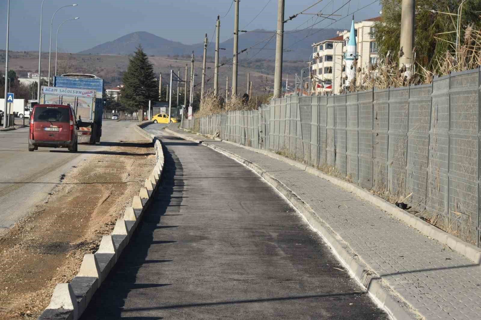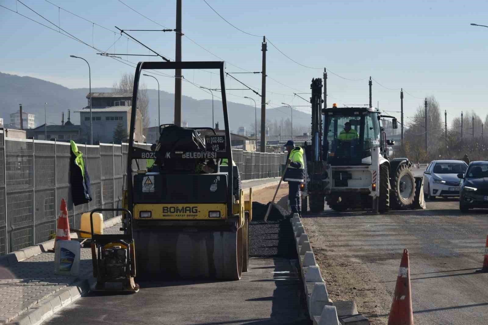 Bozüyük Belediyesi tarafından kapalı pazarın önünden geçen Şenkal Caddesi’nin devamındaki TCDD demiryolu ile Bozüyük Devlet Hastanesi çevreyolu alt geçidi arasındaki bölgede yapılan kaldırım çalışmasının ardından kaldırımın hemen yanında başlatılan bisiklet yolu yapım çalışmaları asfaltlama çalışmaları ile devam ediyor. Bölgede yaşanan yoğun araç trafiğinin yanı sıra yaya ve bisikletli trafiğinin de yoğun olması nedeniyle yapılan çalışmalarda Yeşilkent Mahallesi ve Devlet Hastanesi ilçe merkezine yaya yolu ve bisiklet yolu ile bağlanarak yaya ve bisikletlilerin ulaşımı daha güvenli bir hale gelecek. – İHA