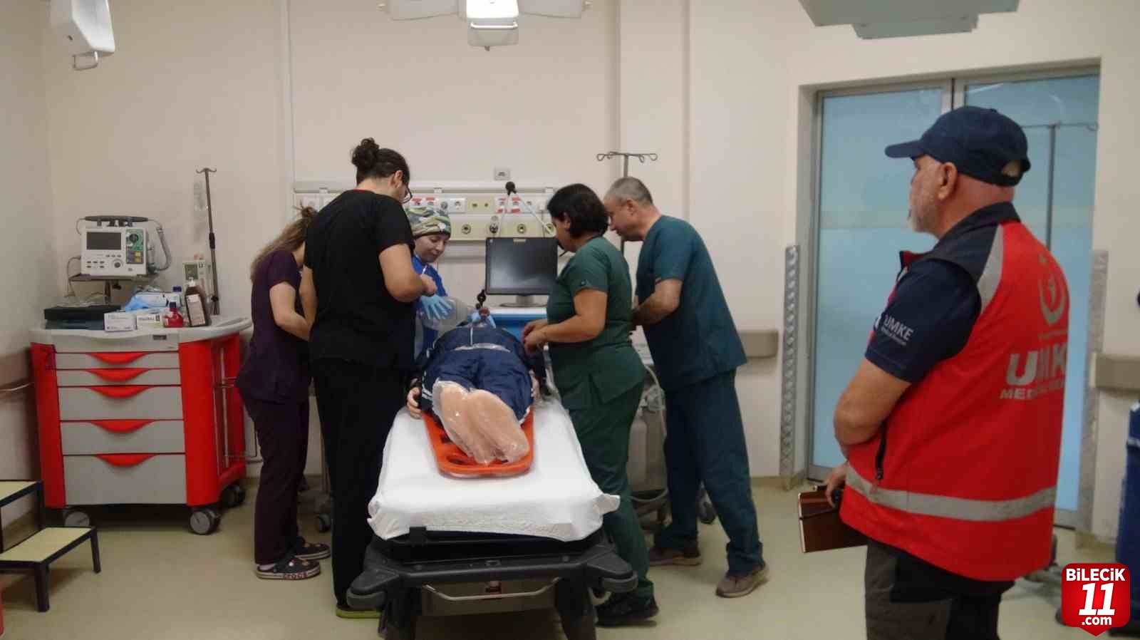 Tatbikata itfaiye, 112 ve polis ekipleri de destek verdi. Senaryo gereği hastanenin ikinci katında yer alan sterilizasyon ünitesinde elektrik kontağından kaynaklı yangın çıktı.