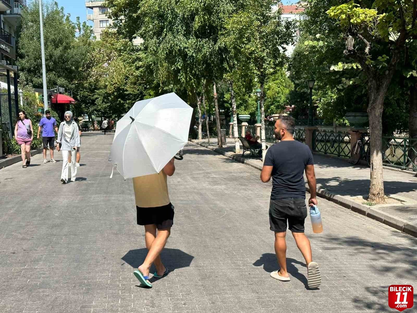Eskişehir’de yüksek hava sıcaklığı vatandaşlara zor anlar yaşatmaya devam ediyor. Geçtiğimiz günlerde 40 derecenin üzerine çıkan sıcaklık, yaklaşık 10 derece düşerek 30 derecelere kadar indi. Sıcaklığın düşmesine rağmen kavurucu havada güneşin zararlı etkilerinden korunmak isteyen vatandaşlar, dışarıda vakit geçirirken şemsiye kullandı. Bu yıl böyle manzaralarla sık sık karşılaşan Eskişehirliler, ‘artık bu görüntüye alıştık, çok mantıklı hareket’ dedi. – İHA