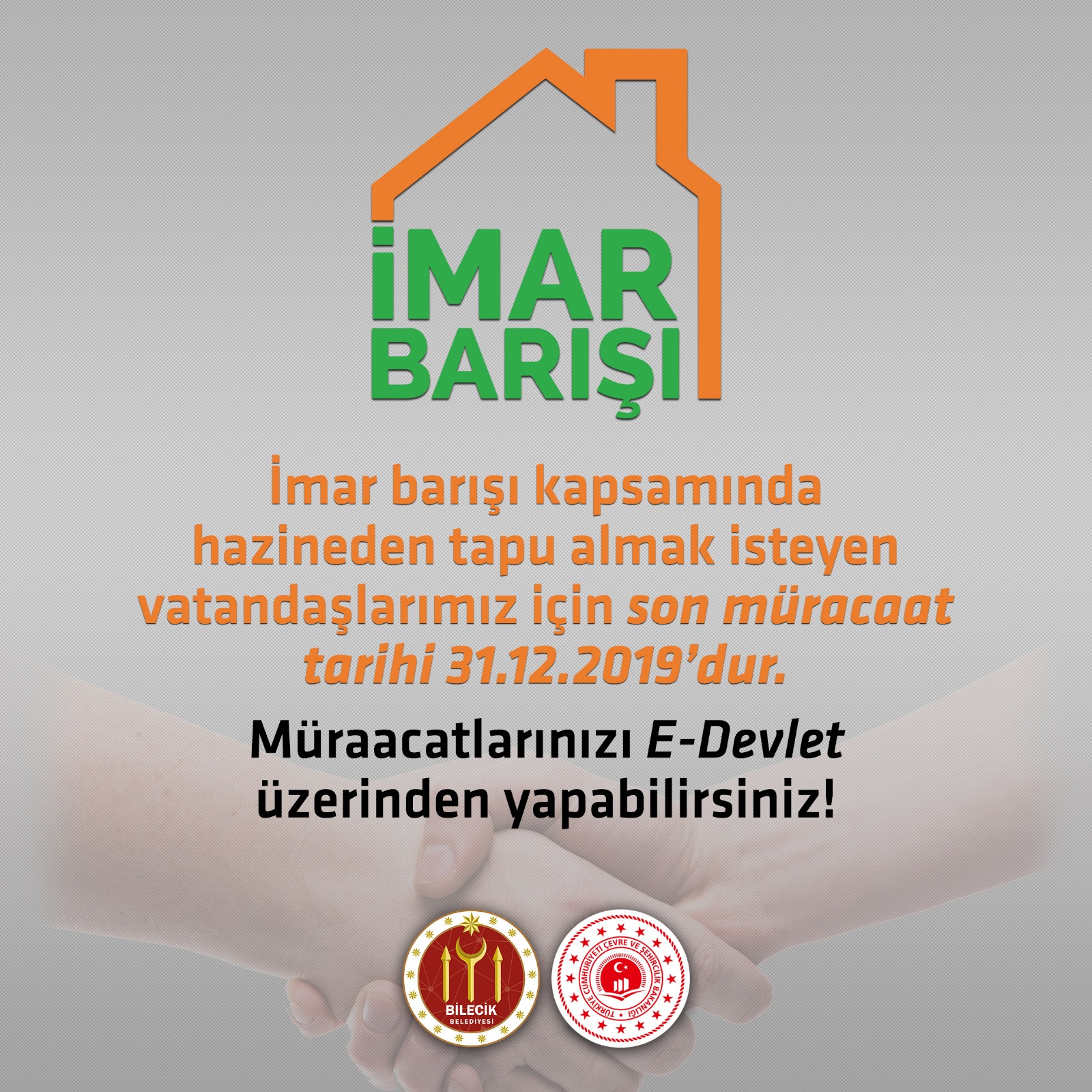 ‘’İmar Barışı kapsamında hazineden tapu almak isteyen vatandaşlarımız için son müracaat tarihi 31 Aralık Salı günüdür. Vatandaşlarımız söz konusu başvurularının E-Devlet üzerinden yapabileceklerdir. Başvuruda yapılması gerekenler, Türkiye Cumhuriyeti Çevre ve Şehircilik Bakanlığı kurumsal sitesindeki https://imarbarisi.csb.gov.tr/ görsel yayınlarda anlatılmaktadır’’ denildi.