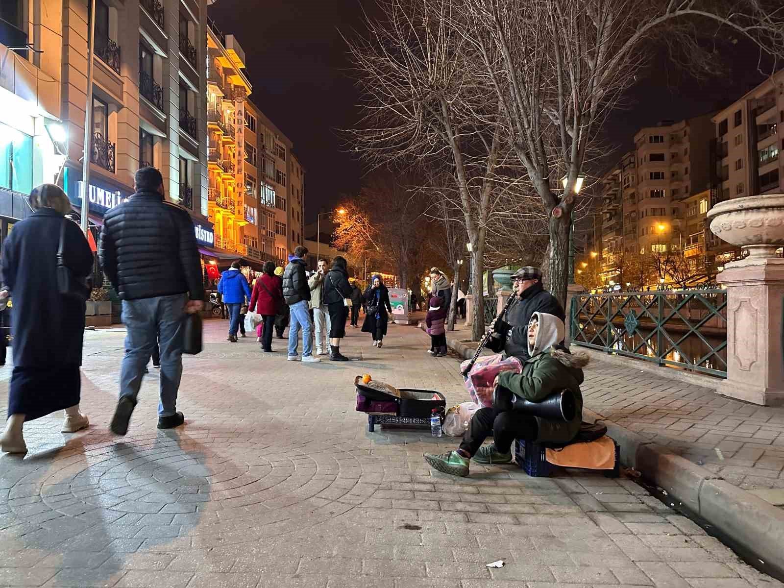 Eskişehir’de yeni yıl kutlamaları başladı. Yeni yıla arkadaşları ve aileleriyle birlikte dışarıda girmek isteyen vatandaşlar, kent merkezinde yoğunluk oluşturdu. Vatandaşlar eğlenirken, seyyar satıcılar ise ekmek teknelerinin başında durarak satış yapmaya devam etti. Soğuk havaya rağmen kestane, pilav, şapka, midye ile benzeri ürünler satan seyyar satıcılar ve müzisyenler, gece geç saatlere kadar çalışacaklarını söyledi.