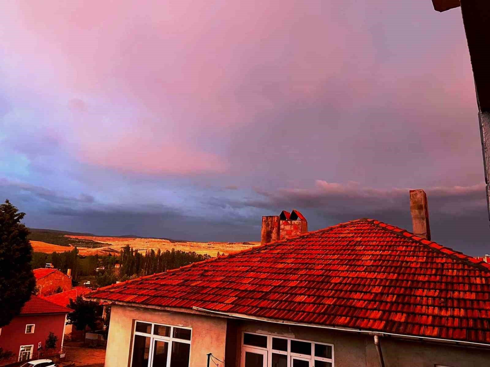 Kütahya’nın Hisarcık ilçesinde gün batarken bulutlara yansıyan güneş ışınları gökyüzünü adeta kızıla boyadı.