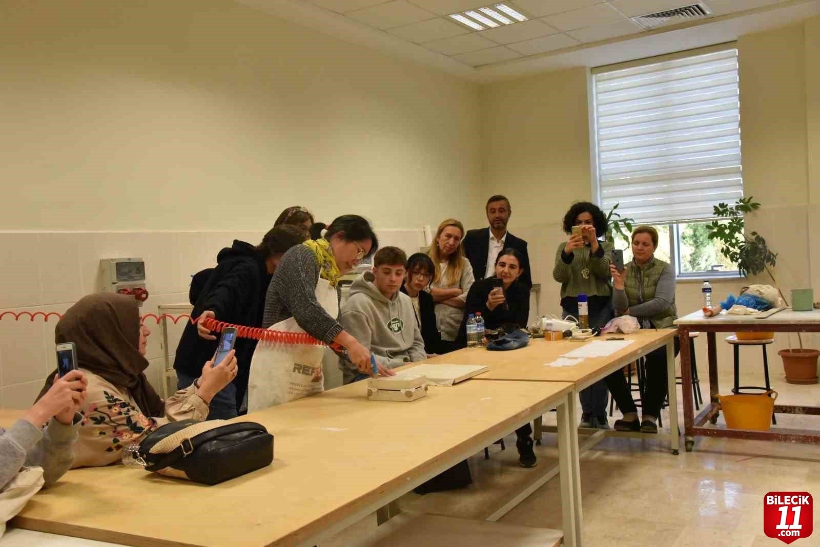 Güzel Sanatlar ve Tasarım Fakültesi Dekanı Prof. Kadir Sevim’in de deneyim ve kazanımlarını paylaştığı sunumda, öğrenciler kalıplar ile deneme yaparak, yeteneklerini sergilemenin mutluluğunu yaşadılar. – İHA