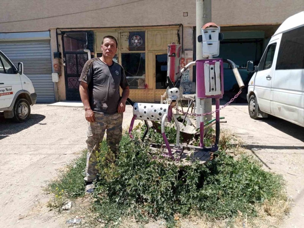 Otomobillerde egzoz, kaporta ve boya gibi sanayi işleriyle uğraşan Sercan Ay, yaklaşık 5 yıl önce elindeki çürük parçalarla ilginç şekiller yaptı. Hurda egzoz parçaları ile insan ve köpek figürü oluşturan Ay, dükkanının maskotunu kendi elleriyle tasarladı. İlginç görüntülü figürler, müşterilerin de beğenisini kazandı. Esnaf, vatandaşlar isterse ilerleyen günlerde bu tarz figürlerin yenisini yapabileceğini ifade etti.
