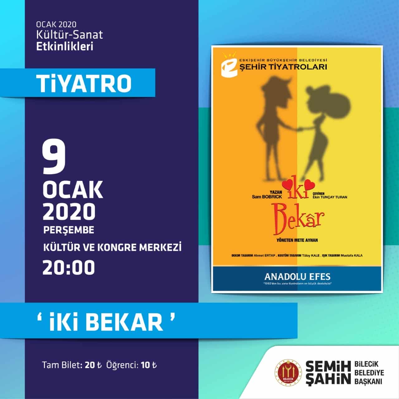 Bilecik Belediyesi tarafından Ocak ayı kültürel etkinlikler kapsamında ‘’İki Bekar’’ adlı tiyatro oyunu sahne alacak.