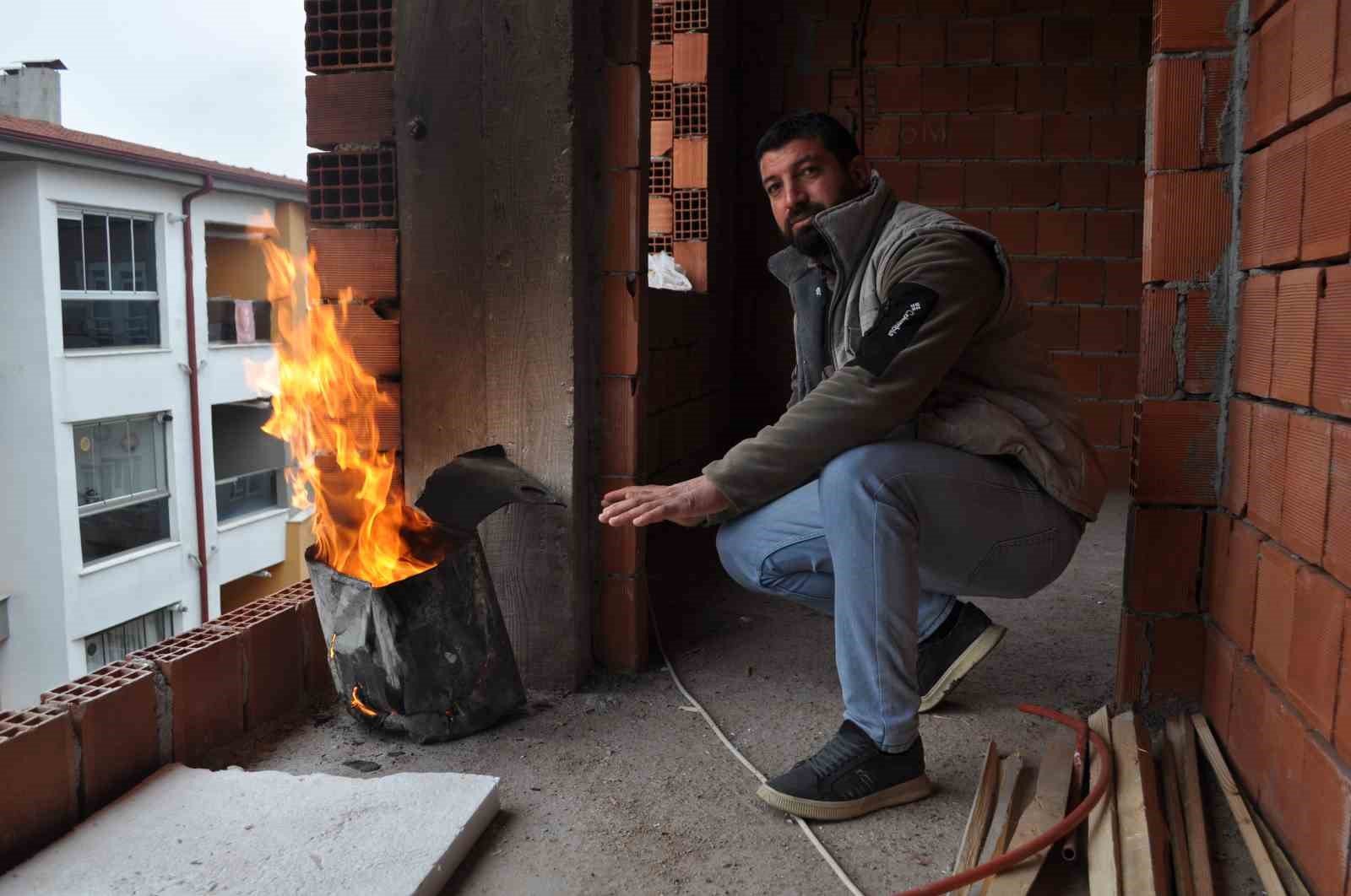Hava sıcaklığının eksi değerlere düştüğü Eskişehir’de, çalışma şartları daha da zorlaşan inşaat işçileri, üşüdükleri zaman işlerine ara verip ateş başına geçerek ve çay içerek ısınmaya çalışıyor.