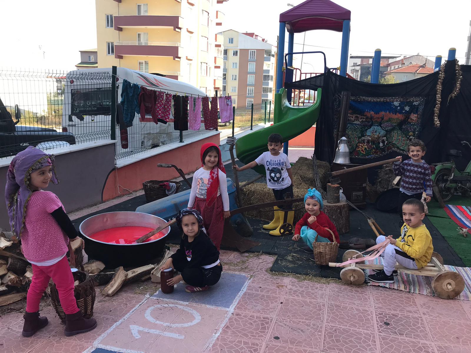 Minik öğrenciler köy konseptinde salça yaparak ve odun kırarak hem eğlendiler hemde öğrendiler.