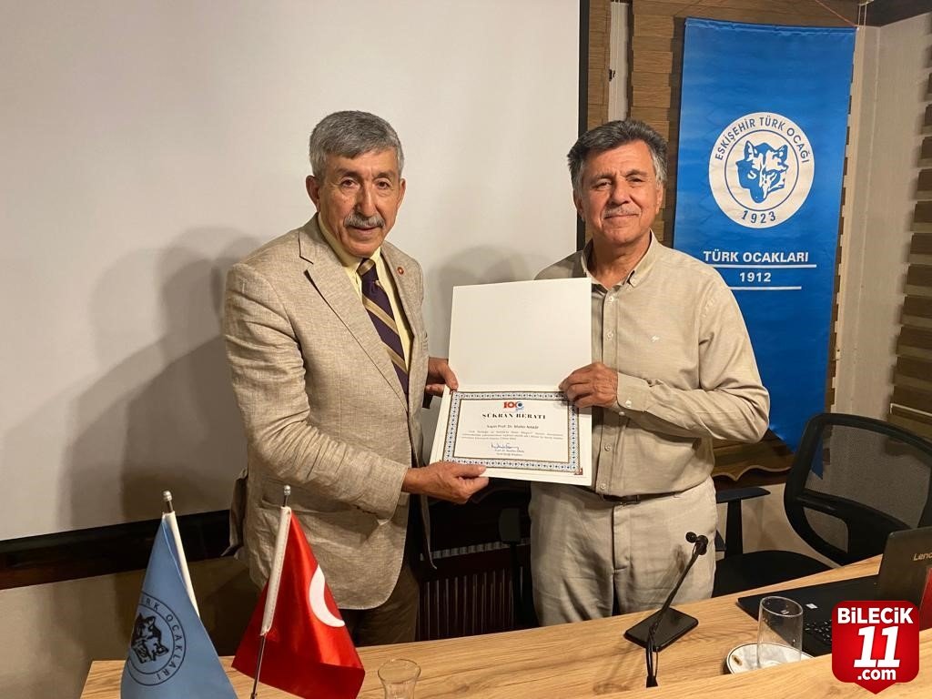 Konuşmanın ardından yapılan soru ve cevap etkinliğinden sonra Ocak Başkanı Prof.Dr. Nedim Ünal, konuşmacıya ‘Şükran Beratı’ takdim etti. – İHA