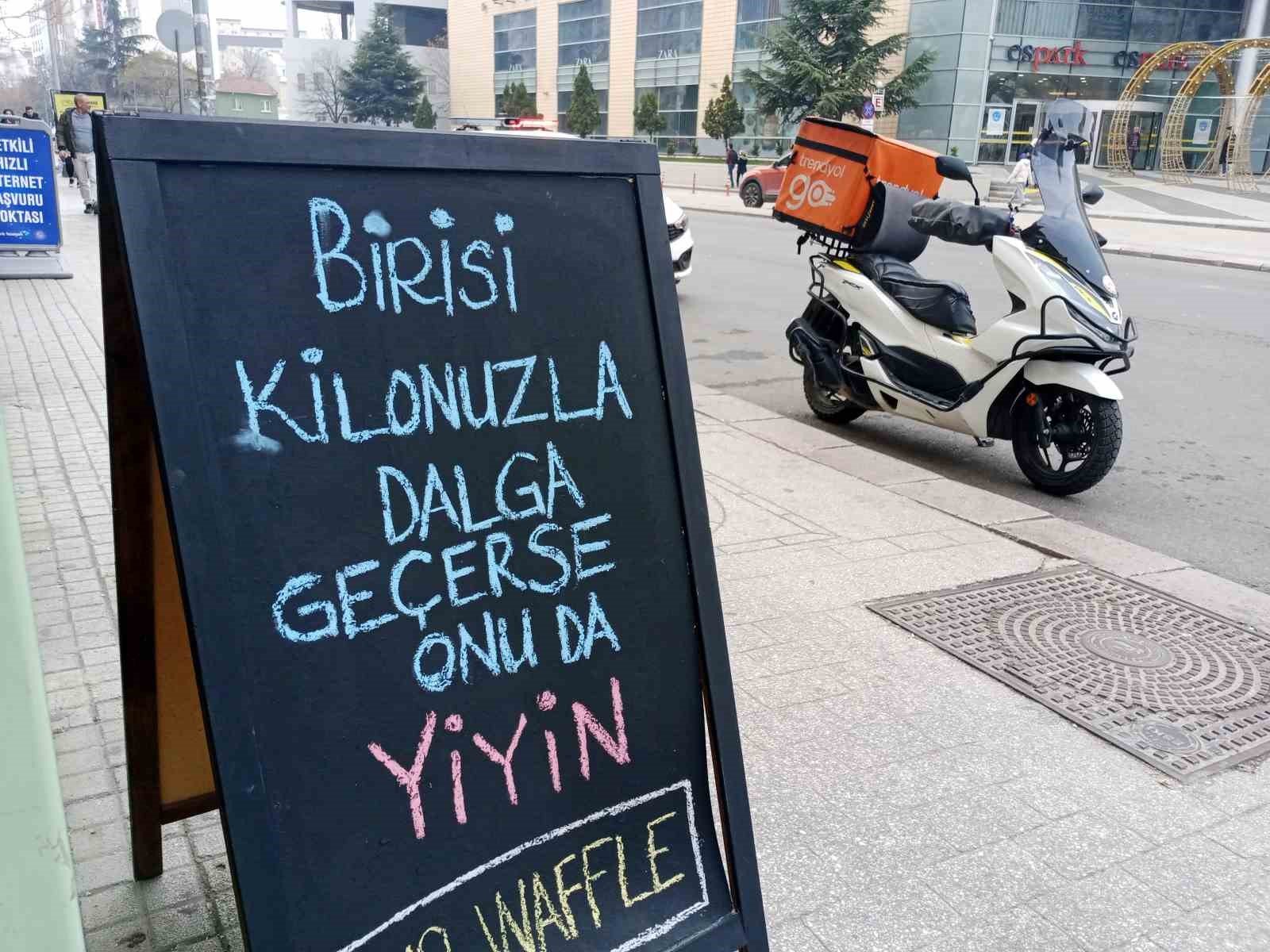 Eskişehir’de bir tatlı işletmesinin önündeki tahtada yer alan, “Birisi kilonuzla dalga geçerse onu da yiyin” yazısı görenleri güldürdü.