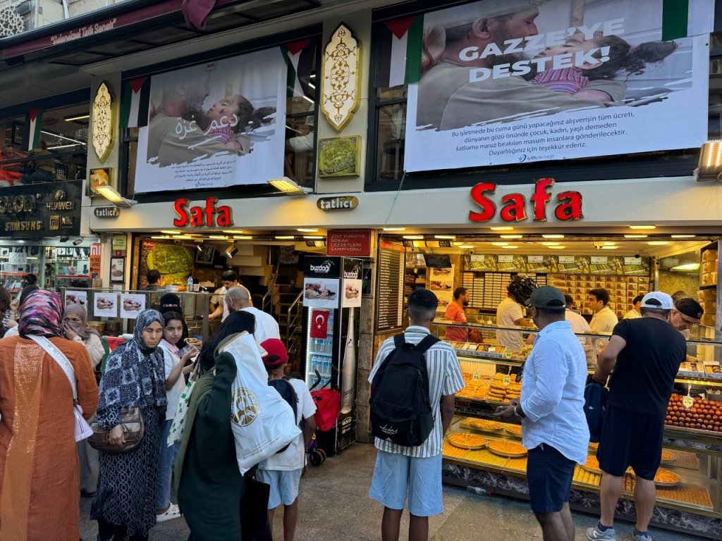 Sirkeci'de 25 yıldır tatlıcılık yapan Mustafa Kaplan, Filistin'de yaşananlara kayıtsız kalmadı. Kaplan, cuma günü yaptığı ciroyu Filistin'de ihtiyaç sahibi olanlara ulaştırılmak üzere bağışladığını dükkanının camlarına astığı pankartlarla duyurdu.