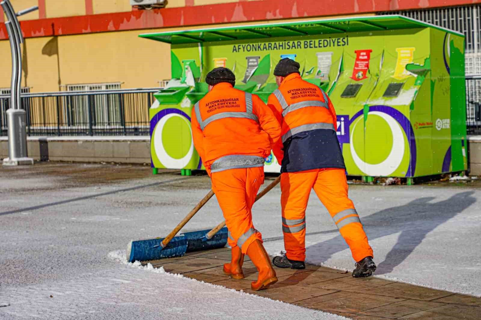 Afyonkarahisar Belediyesine bağlı ekipler kent merkezinde sabah erken saatlerde aniden bastıran yağış sonrası hummalı bir kar temizleme çalışmasına girişti. Ekipler özellikle kaldırımların temizlenmesi için yoğun bir çalışma başlattı. Çalışmalar kent merkezi ile birlikte arar sokaklarda da yapıldı. 200’e yakın personel kaldırım ve yolların açık olması için yoğun bir mesai harcarken çalışmanın günün ilerleyen saatlerinde de devam edeceği belirtildi. – İHA