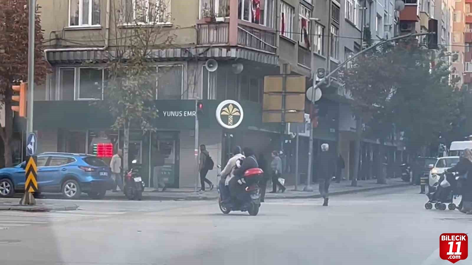 Eskişehir’de kasksız, kucağında bebek ile elektrikli bisiklete binen kadın ve erkeğin kırmızı ışığa rağmen devam eden tehlikeli yolculuğu tepki çekti.