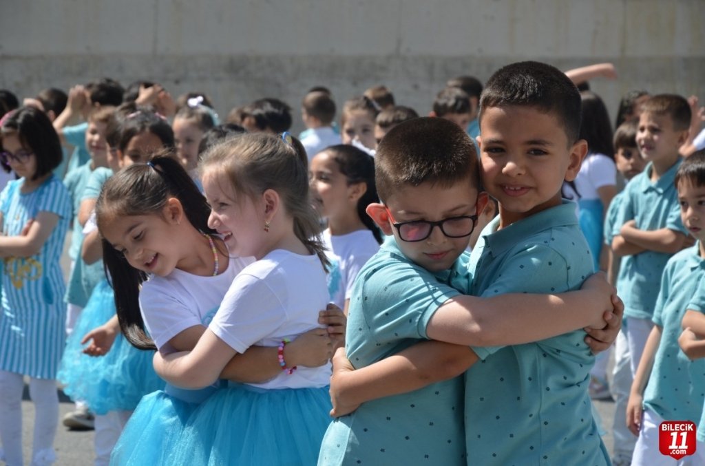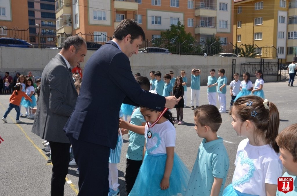 Okul bahçesinde düzenlenen etkinlikte birinci sınıf öğrencileri okuma-yazma öğrenimini tamamlamanın sevinciyle okuma bayramı yaptı.