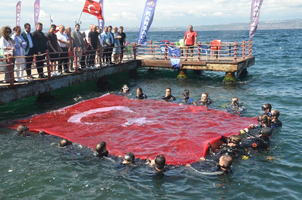 Karamürsel Su Altı Sporları Derneği (KARSAD) tarafından ilçe sahilinde düzenlenen etkinlikte, dalışın ardından deniz yüzeyinde 10 metre uzunluğunda Türk bayrağı açan 17 dalgıç, kıyı şeridinde bekleyenler tarafından alkışlandı.