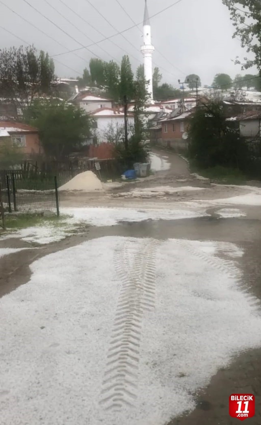 Bilecik’in Bozüyük ilçesine bağlı Yeniüreğil Köyü’nde etkili olan dolu yağışı etrafı beyaza bürüdü.