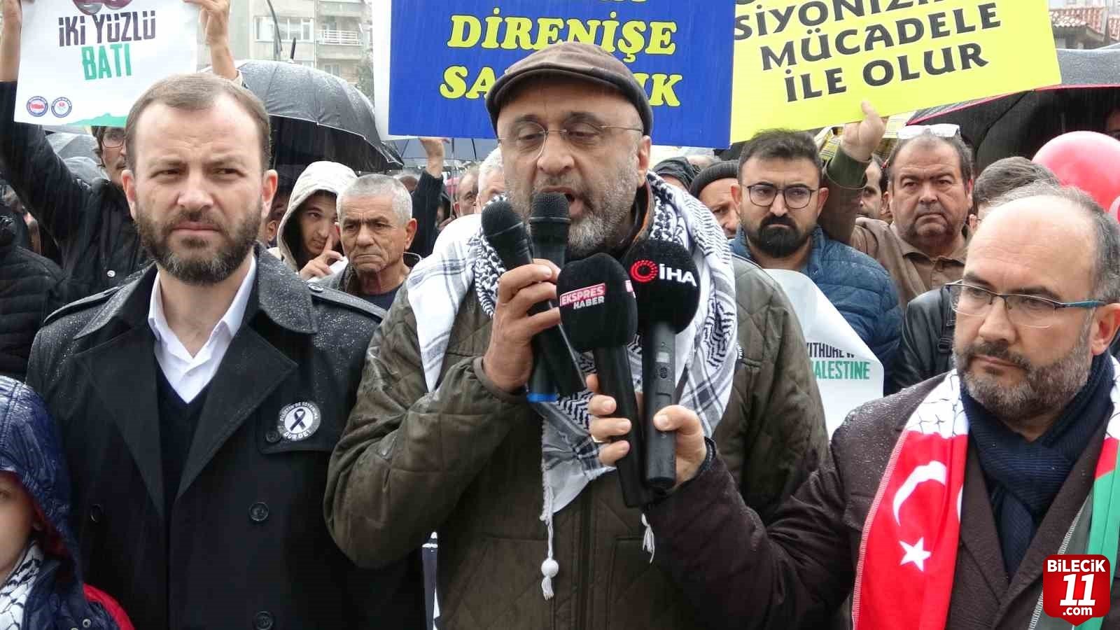 KÜSİDAP adına basın açıklamasını Kütahya İnsani Yardım Derneği Başkanı Mustafa Yenipazar yaptı. Yenipazar, “Filistin’deki kardeşlerimizin başlatmış olduğu ’diriliş hareketi’ dalga dalga tüm yeryüzüne yayılıyor. Biz bu el ele eylemimizle zulme karşı bir duruş sergiliyoruz. Bugün buraya yağmura rağmen toplanan yüzlerce kardeşimizle tarafımızı, duruşumuzu sergiliyoruz. Ortaya koyduğumuz hiçbir gayret karşılıksız kalmaz ve bu gayretlerimizin karşılığını da tüm dünya insanlığı olarak Allah’ın izniyle alacağız. Barış hakim olup, hak hakim olana kadar bu eylemlerimiz devam edecek. Allah’ın izniyle hiç kimseyi uyutmayacağız. Uyuyan kardeşlerimizi de uyandıracağız” diye konuştu.