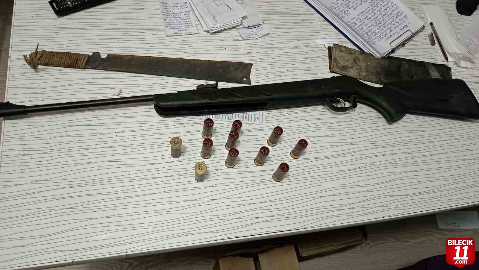 İşletmede yapılan aramada, 1 adet pompalı av tüfeği, 11 adet dolu av tüfeği fişeği, 1 adet havalı tüfek ve 1 adet pala ele geçirildi. Alkollü mekanda yapılan aramada, toplam 6 adet tabanca ve bu tabancalara ait 36 adet fişek ele geçirildi.