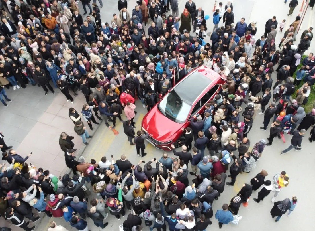 Kütahya’da ilk defa vatandaşlarla buluşturulan Anadolu kırmızısı Togg’u gören binlerce vatandaş etrafını sardı.