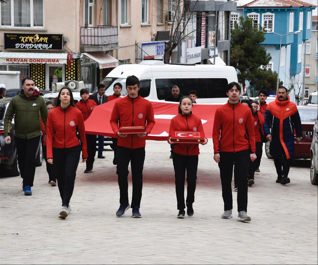 Cumhurbaşkanı Recep Tayyip Erdoğan’a 18 Mart’ta sunulmak üzere Gelibolu Yarımadası’ndan alınan toprak, deniz suyu ve Türk bayrağı, Bursalı atletler tarafından Bilecikli sporculara teslim edildi.